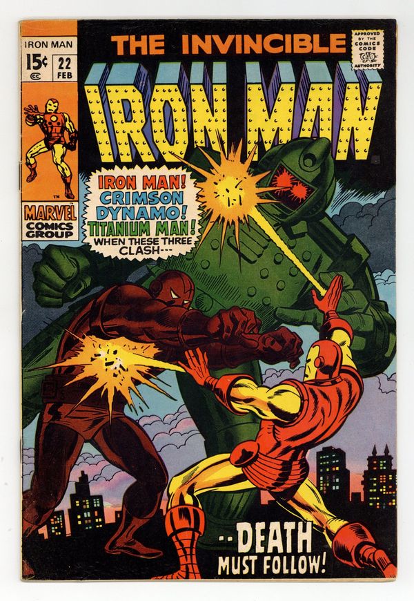 Tags: Marvel Legacy Numbering: Iron Man (part 22), Iron Man$14.75"From This Conflict...Death!" Story by Archie Goodwin. Art by George Tuska and Joe Gaudioso. It's an epic clash of the titans as the golden avenger finds himself in a desperate three-way battle against the Crimson Dynamo and the Titanium Man! Unfortunately, Janice Cord is caught in the crossfire of the fight at the Cord Manufacturing Plant. Can the Invincible Iron Man defeat his two armored adversaries and save Janice? Or will his victory be a pyrrhic one? (Notes: The tragic events of this issue will pit Iron Man against the Crimson Dynamo for years to come. Their next confrontation takes place in Avengers 130.) 32 pages Cover price $0.15.
