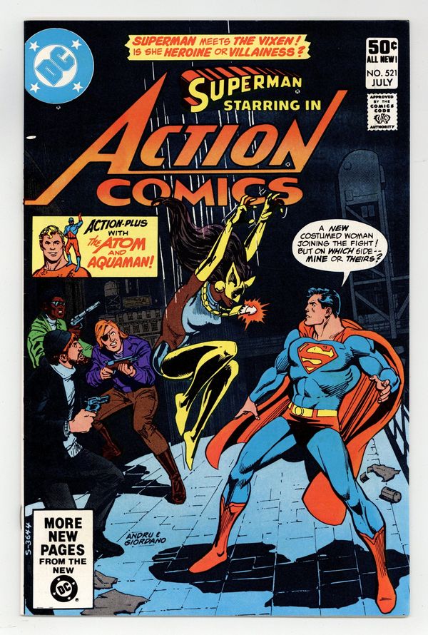 Tags: Superman$45.00Direct Edition. Cover pencils by Ross Andru, inks by Dick Giordano. "The Deadly Rampage of the Lady Fox," script by Gerry Conway, pencils by Curt Swan, inks by Frank Chiaramonte; In New York City, the Vixen steals a van full of furs that belong to entrepreneur Mordecai Mule; Superman, attending a function at Madison Square Garden, learns of the robbery and gives chase; Superman and Vixen team up to stop a horde of elephants. "Grow, Little Growfish!", script by Bob Rozakis, pencils by Alex Saviuk, inks by Vince Colletta; Off the coast of Virginia, Aquaman experiments with his telepathic powers by sending out a routine mental scanning wave; He discovers a large, gelatinous organism that shrinks in size; Aquaman contacts the Atom, who teleports over to investigate. 36 Pages, Full Color, $0.50. Cover price $0.50.