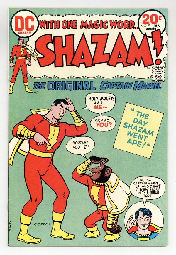 $8.60Cover by C. C. Beck. Worms of the World, Unite!, script by Denny O'Neil, art by C. C. Beck; Mr. Mind collects earthworms into one location to amplify their power with a Hate-Projector in an attempt to destroy Captain Marvel. The Mystery of the Missing Newsstand!, script by Elliot S! Maggin, art by Dave Cockrum; Captain Marvel, Jr. battles a gang of crooks who stole Freddy's newsstand. The Day Captain Marvel Went Ape!, script by Elliot S! Maggin, art by C. C. Beck; A strange jewel causes the lightning bolt that changes Billy Batson into Captain Marvel to be redirected to other people, including Bonzo the Chimp. 36 pgs., full color. $0.20. Cover price $0.20.
