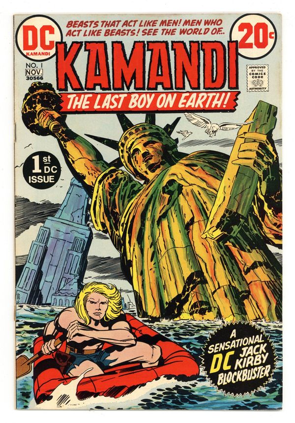 $19.001st appearance and origin of Kamandi. "The Last Boy on Earth." Script and pencils by Jack Kirby, inks by Mike Royer. Cover by Kirby and Royer. A series that borrows many concepts from Planet of the Apes, Kamandi takes place in an alternate future where animals have mutated into bipedal beings of intelligence and where humans are treated like savage beasts. Kamandi avenges the death of his grandfather, who was killed by wolves, but is then captured by a tiger named Caesar, who turns him over to dog-scientist Dr. Canus. Canus proceeds to help Kamandi, and this is where the so-called last boy on earth hooks up with Ben Boxer, a mutated human who can turn to living metal. Cover price $0.20.