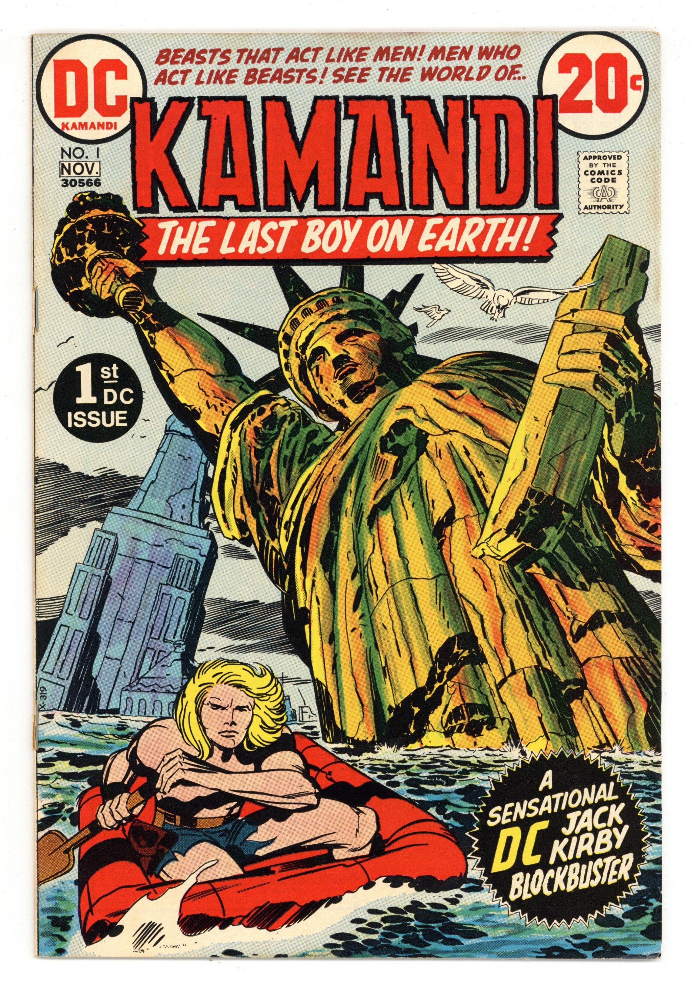 $16.001st appearance and origin of Kamandi. "The Last Boy on Earth." Script and pencils by Jack Kirby, inks by Mike Royer. Cover by Kirby and Royer. A series that borrows many concepts from Planet of the Apes, Kamandi takes place in an alternate future where animals have mutated into bipedal beings of intelligence and where humans are treated like savage beasts. Kamandi avenges the death of his grandfather, who was killed by wolves, but is then captured by a tiger named Caesar, who turns him over to dog-scientist Dr. Canus. Canus proceeds to help Kamandi, and this is where the so-called last boy on earth hooks up with Ben Boxer, a mutated human who can turn to living metal. Cover price $0.20.
