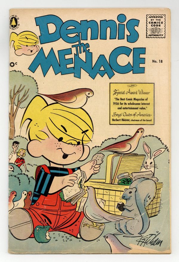 Published Sep 1956 by Standard/Pines/Haliden.$4.80Cover art by Hank Ketcham. Reprints of daily Dennis the Menace cartoons by Hank Ketcham. City Park starring Dennis the Menace, script by Fred Toole, art by Al Wiseman. Photo Finish starring Dennis the Menace, script by Fred Toole, art by Al Wiseman. The Big Question... text story. Beauty Shop, script by Fred Toole, art by Al Wiseman. Screamy Mimi, art by Al Wiseman. Just Married starring Dennis the Menace, script by Fred Toole, art by Al Wiseman. Dennis the Menace Wins Boys' Club Award; The Best Comic Magazine of 1956 for Its Wholesome Interest and Entertainment Value. 36 pgs. $0.10. Cover price $0.10.