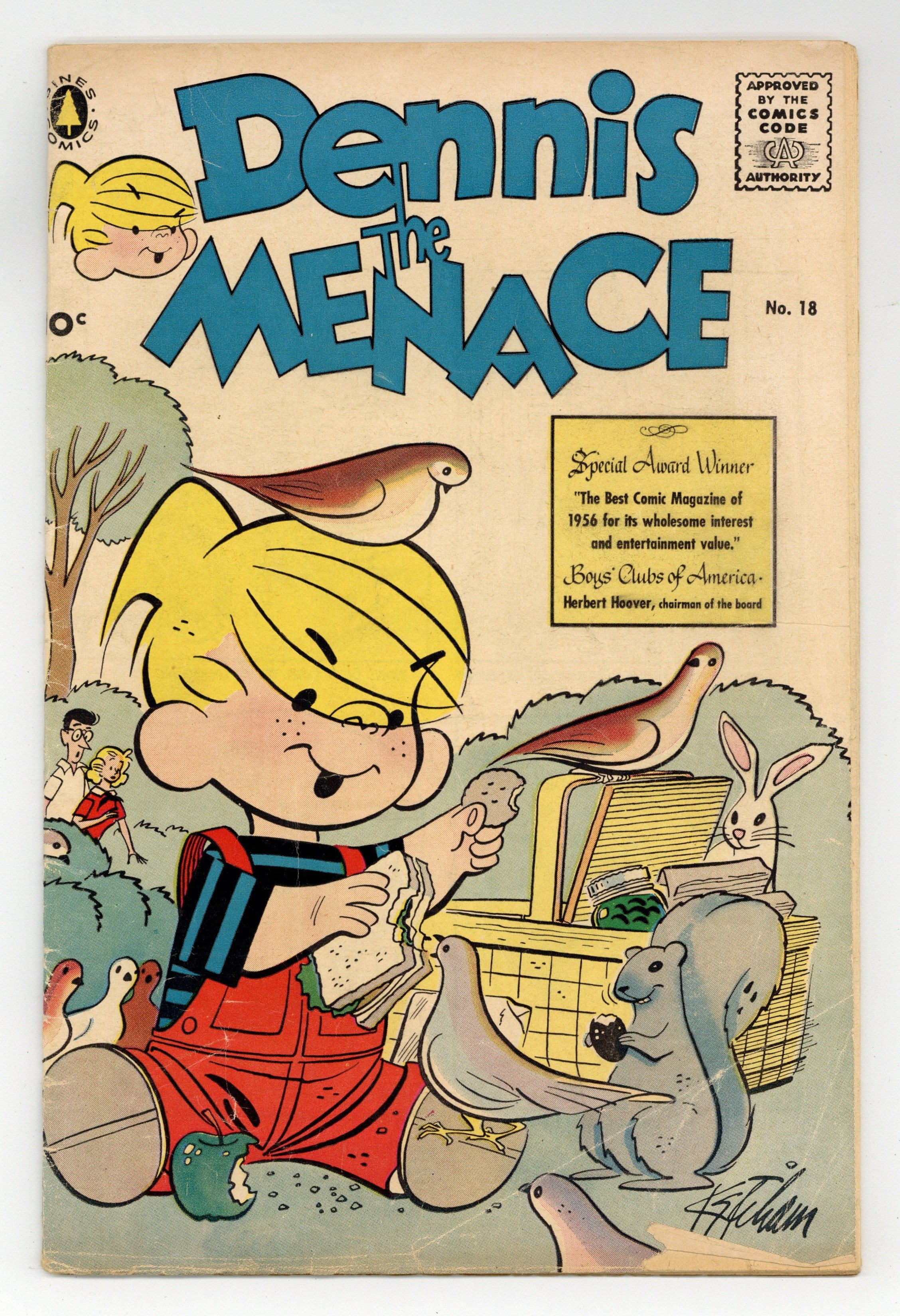 Cover art by Hank Ketcham. Reprints of daily Dennis the Menace cartoons by Hank Ketcham. City Park starring Dennis the Menace, script by Fred Toole, art by Al Wiseman. Photo Finish starring Dennis the Menace, script by Fred Toole, art by Al Wiseman. The Big Question... text story. Beauty Shop, script by Fred Toole, art by Al Wiseman. Screamy Mimi, art by Al Wiseman. Just Married starring Dennis the Menace, script by Fred Toole, art by Al Wiseman. Dennis the Menace Wins Boys' Club Award; The Best Comic Magazine of 1956 for Its Wholesome Interest and Entertainment Value. 36 pgs. $0.10. Cover price $0.10.