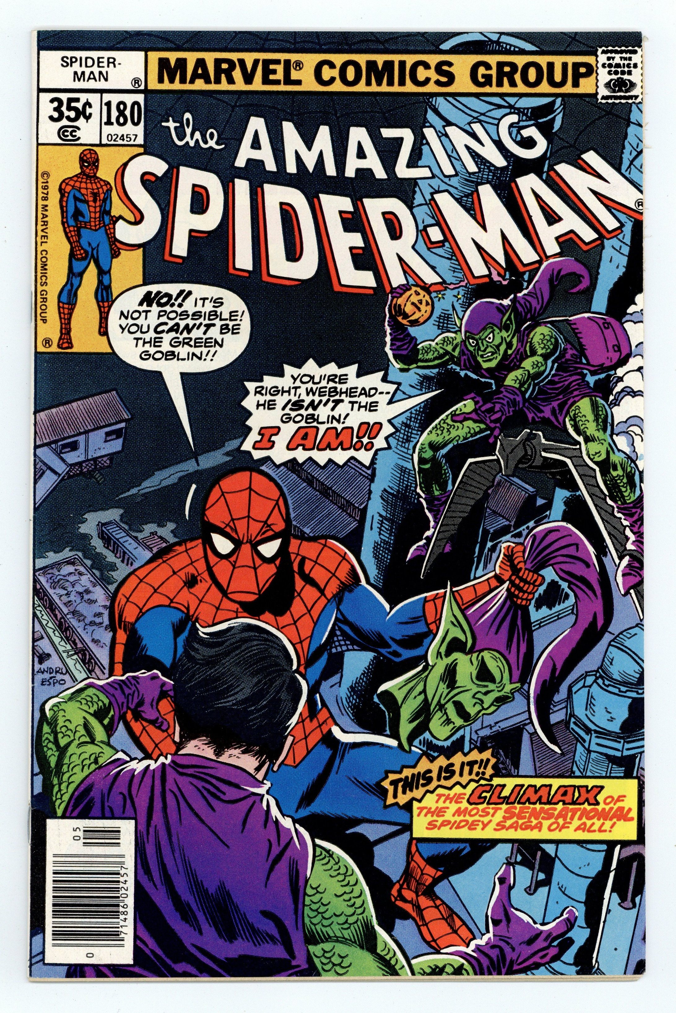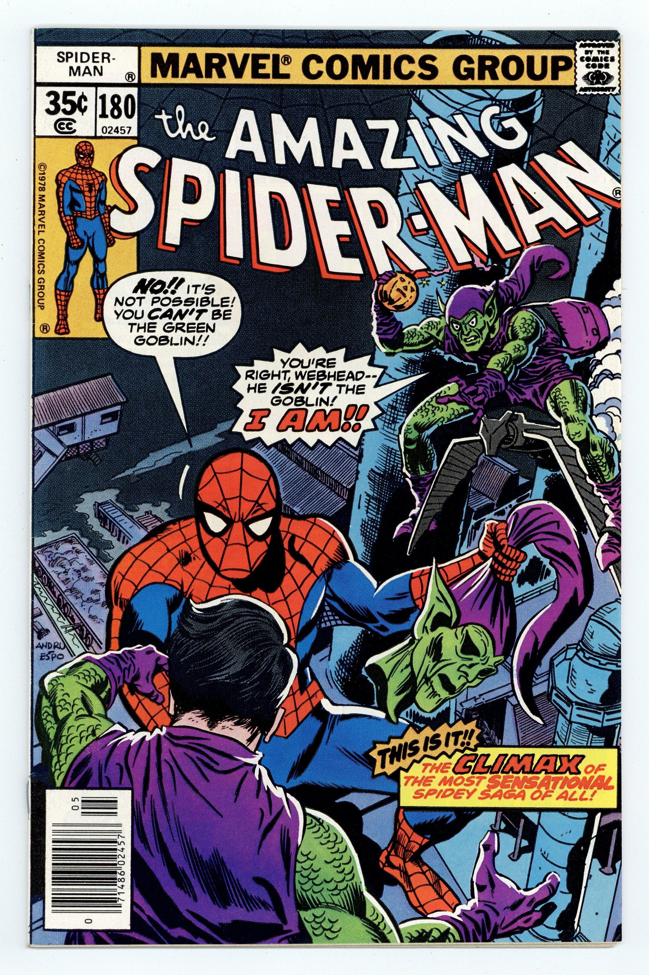 Tags: Marvel Legacy Numbering: Amazing Spider-Man (part 180), Spider-Man$75.00"Who Was That Goblin I Saw You With?" Part 5 of 5. Script by Len Wein. Art by Ross Andru (breakdowns) and Mike Esposito (finishes). Cover by Ross Andru and Mike Esposito. This is it! The awesome conclusion to the five-part goblin saga! At Radio City Music Hall, the Green Goblin emerges triumphant! And the devious purple and green villain flies to an incinerating plant in Brooklyn to throw the unconscious web-slinger into a smokestack! But the spectacular one wakes up just in time! And the final donnybrook between the Green Goblin and the Amazing Spider-Man begins! The wall-crawler is in control of the battle...until a second goblin arrives on the scene! What?! Who? The web-slinger watches in shock as the battle of the goblins unfolds! Can Harry Osborn exorcise the demons of his past? And somehow return to a normal life? An uplifting story! Final appearance of Dr. Bart Hamilton. Cameo appearances by Silvermane, J. Jonah Jameson, Joe Robertson, and Liz Allan. Flashback cameos by Harry Osborn and the Spider-clone. (Notes: More than a decade passes before Harry Osborn becomes the Green Goblin again in Amazing Spider-Man 312. The incinerating plant in this story is the same one where the web-slinger disposed of his clone in Amazing Spider-Man 151. Silvermane returns in Spectacular Spider-Man Annual 2. This issue concludes Len Wein's terrific two-and-a-half year run as the writer of the Amazing Spider-Man title.) 32 pages. Cover price $0.35.