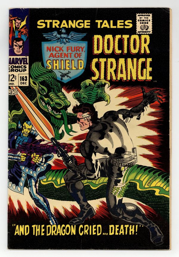 Cover art by Jim Steranko. Nick Fury stars in "And the Dragon Cried... Death!", script and pencils by Jim Steranko, inks by Frank Giacoia; As Fury escapes the monster octopus, The Yellow Claw spies on A.I.M.; Torn by her conscience, Suwan contacts Jimmy Woo who tells Fury of the Claw's plans to steal The Ultimate Annihilator from A.I.M. Fury meets Clay Quartermain who joins him on his mission to tackle an A.I.M. squad; They retrieve a dragon statue which the Claw steals, unaware it was only a duplicate. "Three Faces of Doom!", script by Jim Lawrence and Dan Adkins (co-plot), art by Dan Adkins; The Living Tribunal learns that Nebulos' staff is a force of evil which he must destroy; As the Tribunal & Nebulos battle, Strange fears for the life of the missing Victoria; The Tribunal uses "Cosmic Lightning" to begin destroying Nebulos' home planet; As Nebulos refuses to hand over his staff to the Tribunal, Strange wrests it away as Nebulos is buried under an avalanche. Marvel Marching Society info and coupon. NOTE: 1st appearance of Clay Quartermain. 36 pgs., full color. Cover price $0.12.