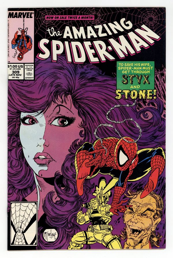Tags: Marvel Legacy Numbering: Amazing Spider-Man (part 309), Spider-Man$10.75"Styx and Stone!" Part 2 of 2. Script by David Michelinie. Art by Todd McFarlane. Cover by Todd McFarlane. The Amazing Spider-Man continues to comb the city for his dear wife Mary Jane! And word of the web-slinger's frantic search reaches Jonathan Caesar! As a result the demented businessman hires two creepy assassins to exterminate the wall-crawler! When Styx and Stone ambush the amazing one in Central Park, it looks indeed like Spidey's bones will be broken! But help from an unlikely redhead may save the day! First appearance of Styx and Stone. Cameo appearances by Glory Grant, J. Jonah Jameson, Joe Robertson, and Sergeant Tork. (Note: Styx and Stone return in Amazing Spider-Man 332.) 32 pages. Cover price $1.00.