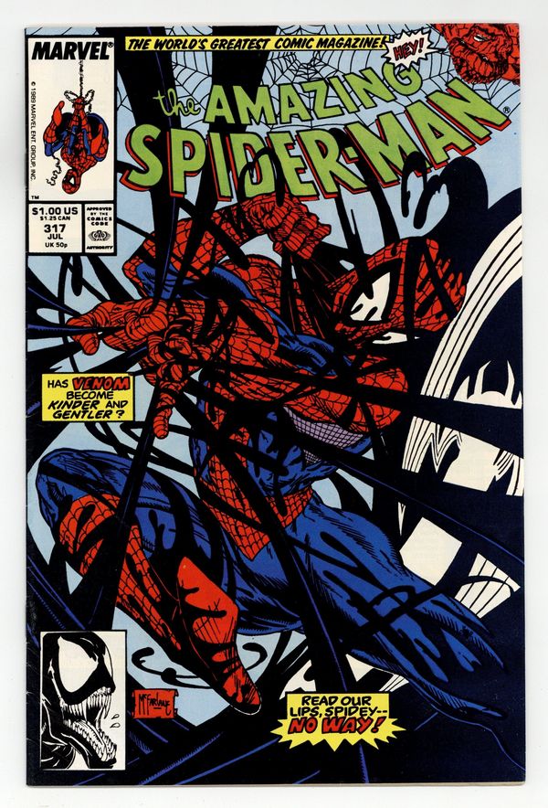 $15.25Direct Edition. "The Sand and the Fury!" Part 2 of 2. Script by David Michelinie. Art by Todd McFarlane. Cover by Todd McFarlane. After fleeing from Venom last issue, the web-slinger returns to the sanctuary of Aunt May's home in Queens! Peter and Mary Jane have only been living there for a few days and haven't had any visitors. But suddenly their first one knocks on the door: Venom! What?! Is the crazed villain going to slay Aunt May and her elderly boarders? No, the savage psychopath just stopped by to issue a challenge to her wall-crawling nephew! Meet in the morning at Montauk Point off Long Island Sound for a duel to the death! Wow, does the web-slinger have a chance vs. the overpowering Venom? The situation does not look good for your friendly neighborhood Spider-Man. Cameo appearance by the Thing (aka Ben Grimm). (Notes: Venom appears next in the Avengers' graphic novel: Death Trap The Vault. Venom returns to torment the web-slinger again in Amazing Spider-Man 332 & 333.) 36 pages. Cover price $1.00.
