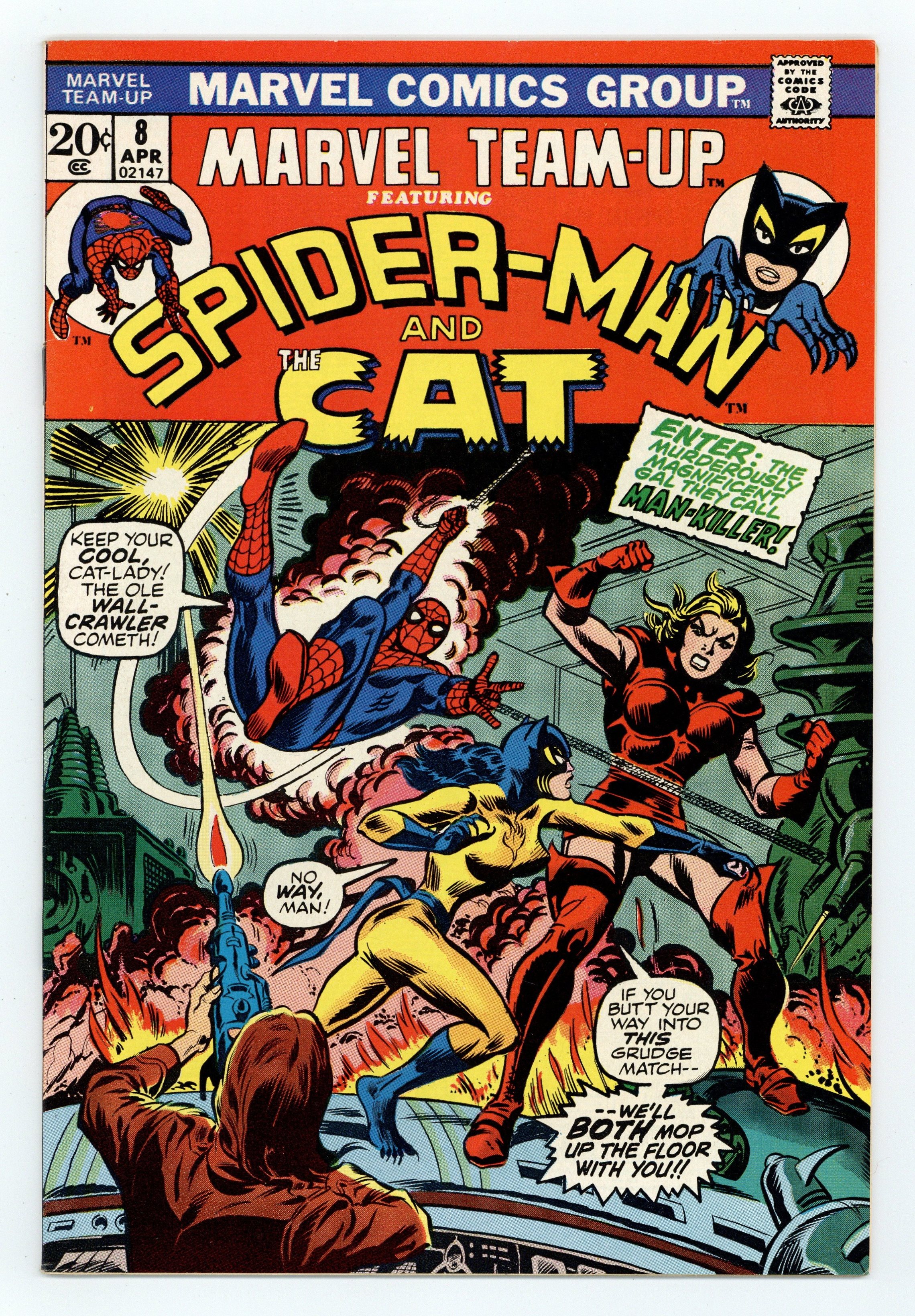 "The Man-Killer Moves at Midnight!" Guest-starring Spider-Man and the Cat. Script by Gerry Conway. Art by Jim Mooney. Cover by Jim Mooney. The Cat (aka Greer Nelson) comes to New York City to recruit the web-slinger -- for a fight against Man-Killer! Apparently, the Man-Killer murdered a politician in Chicago, and now she's in the Big Apple to do likewise. But Spider-Man and the future Tigra have a plan to stick it to the Man-Killer! First appearance of Man-Killer. (Notes: The Cat appears in this story between issues #3 and #4 of the Cat (1972) title. The Cat becomes Tigra in Giant-Size Creatures (1974) #1.) 36 pages. Cover price $0.20.