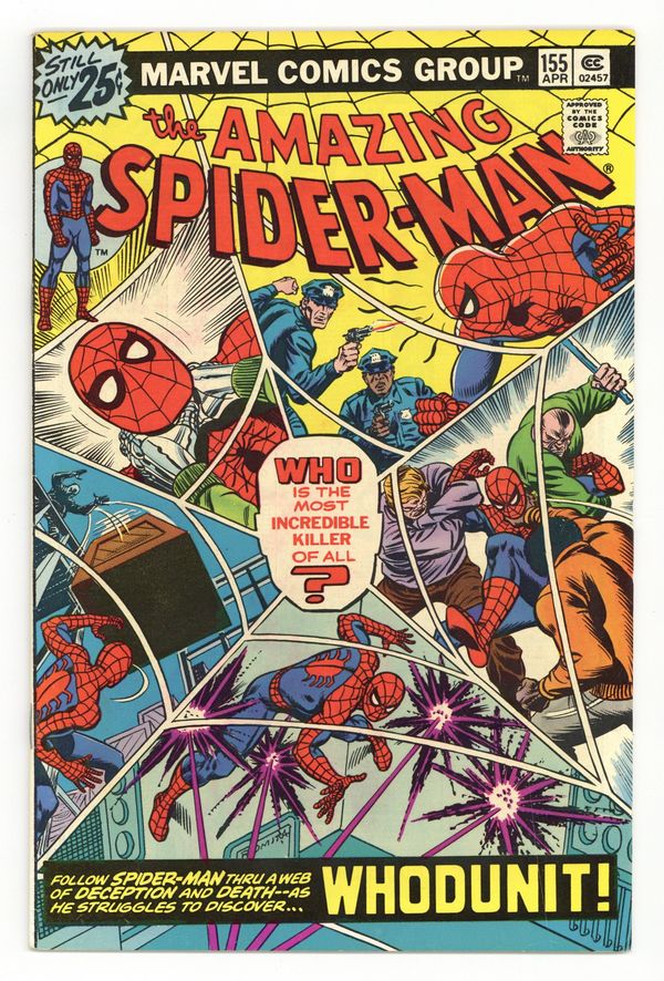 Tags: Marvel Legacy Numbering: Amazing Spider-Man (part 155), Spider-Man$18.00"Whodunit!" Script by Len Wein. Art by Sal Buscema (layouts) and Mike Esposito (finishes). Cover by John Romita. In shocking fashion the co-developer of the Worldwide Habitual Offender database is found murdered in his research lab! And the task of finding the killer falls to none other than your friendly neighborhood Spider-Man! The web-slinger scours the city searching for suspects! But the trail of clues leads back to the lab! Who is the killer? Who indeed! Cameo appearances by Joe Robertson and J. Jonah Jameson. (Notes: The letters page includes a statement of ownership: average print run 530,714; average paid circulation 273,773. This story was reprinted in Marvel Tales 132. A 30-cent cover price variant exists for this issue.) 36 pages. Cover price $0.25.