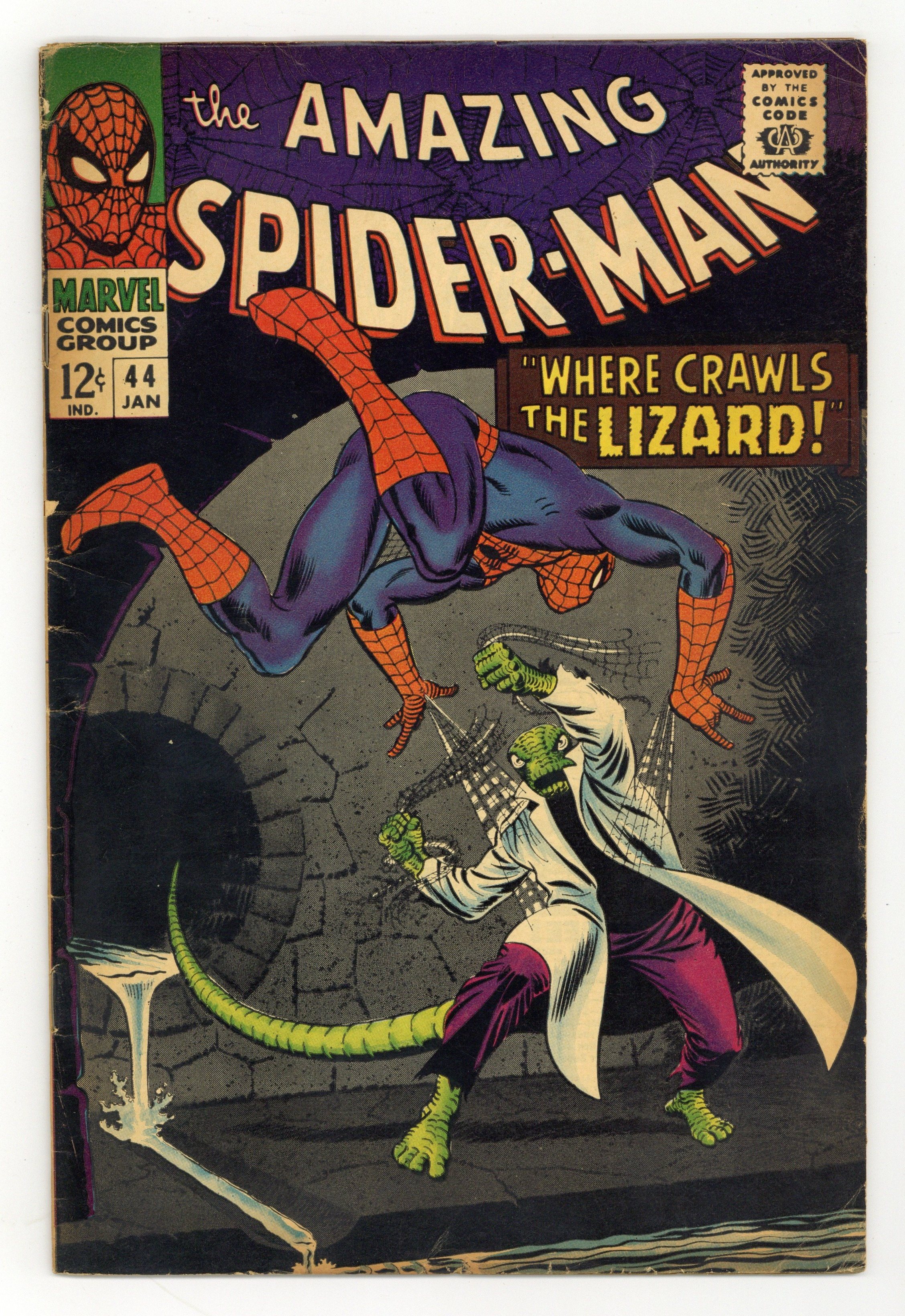 Tags: Marvel Legacy Numbering: Amazing Spider-Man (part 44), Spider-Man$120.00Cover by John Romita Sr. Second appearance of the Lizard in "Where Crawls the Lizard," script by Stan Lee, art by John Romita Sr.; Dr. Connors reacts from The Rhino antidote he was previously working on and turns into The Lizard; Realizing this, he runs away but is spotted by his son Billy; The Lizard plots his human conquest and plans to defeat Spider-Man. Reprinted in Marvel Tales # 184. 36 pgs., full color. $0.12. Cover price $0.12.