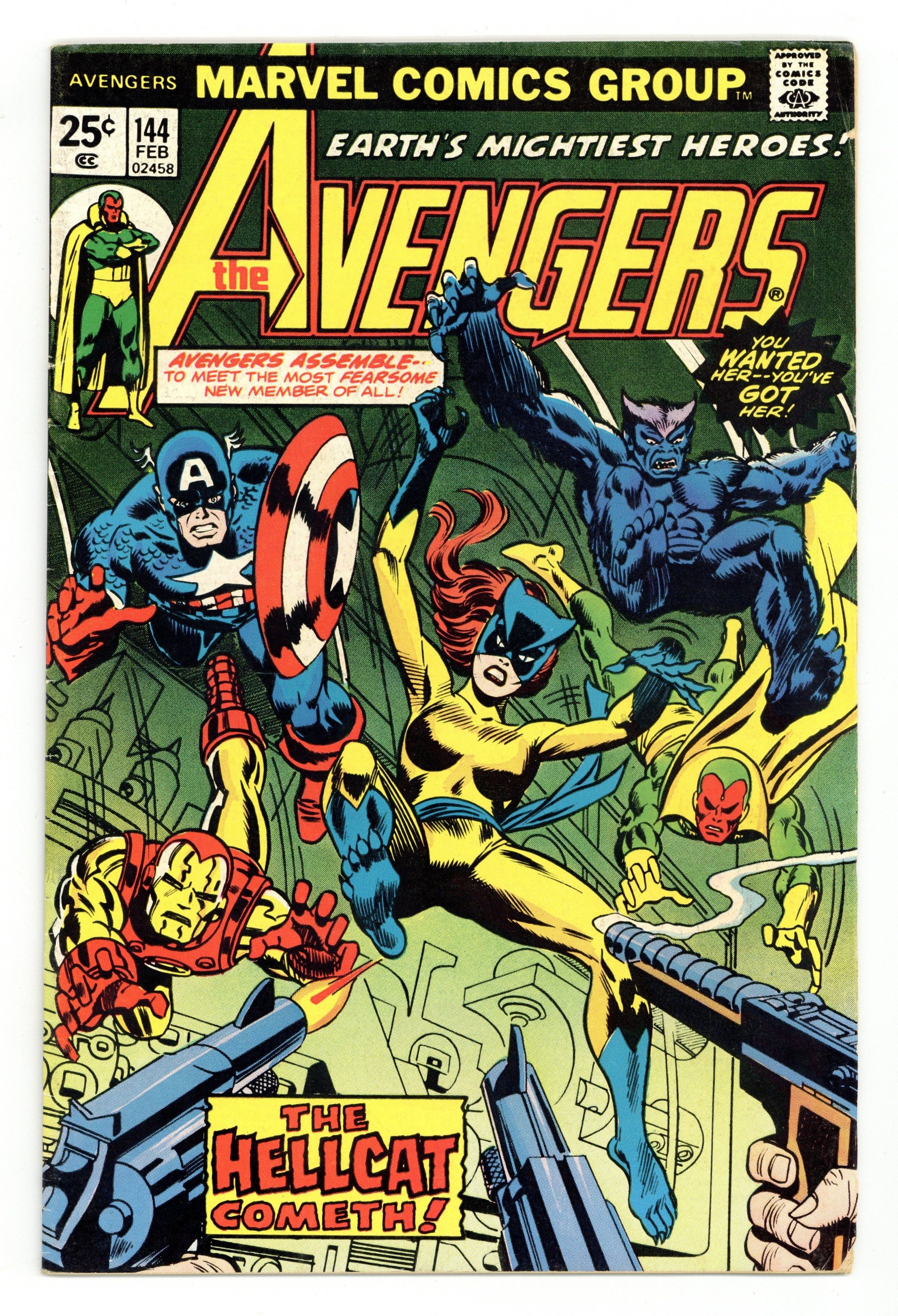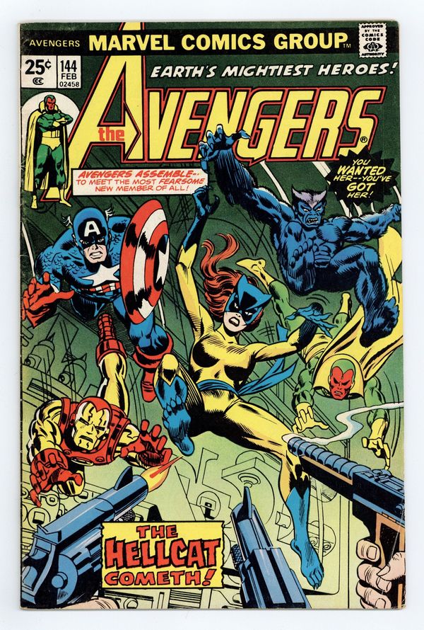 "Claws!" Part 4 of 7. First appearance of Hellcat. Script by Steve Englehart. Pencils by George Perez. Inks by Mike Esposito. Cover by Gil Kane and Frank Giacoia. The Avengers are free inside the Brand Corporation's Long Island facility! However, it doesn't take long for Hugh Jones and Buzz Baxter to locate them and activate the plant's internal military-grade weapons! During the missile attack, the Avengers are forced to split up. The Beast, Vision, and Scarlet Witch go one way...and Captain America, Iron Man, and Patsy Walker go another! When Shell-head comes across the former uniform of the Cat, the shield-slinger gets an idea! And in a dazzling transformation...Patsy Walker becomes Hellcat! The Avengers could use another hero on their side, because the rematch with Doctor Spectrum, the Golden Archer, Hyperion, Lady Lark, and the Whizzer is coming up fast! An excellent issue! The story (part 5) continues in Avengers 147. Origin of Patsy Walker. Cameo appearances by the Two-Gun Kid, Hawkeye, Moondragon, and Thor. Flashback cameos by the Fantastic Four, Spider-Man, and Tigra. (Notes: The letters page includes letters from comics writer Peter Gillis and comics writer Mary Jo Duffy, respectively. The letters page also contains Marvel Value Stamp Series B #39 Thor by Jack Kirby.) 36 pgs. Cover price $0.25.