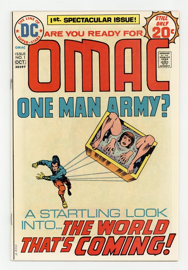 $18.001st appearance and origin of Omac by Jack Kirby in the story, "Brother Eye and Buddy Blank." A transmission from the orbiting Brother Eye turns factory worker Buddy Blank into Omac, the One Man Army Corps. Script and pencils by Jack Kirby, inks by Mike Royer. Cover by Kirby and Royer. Cover price $0.20.