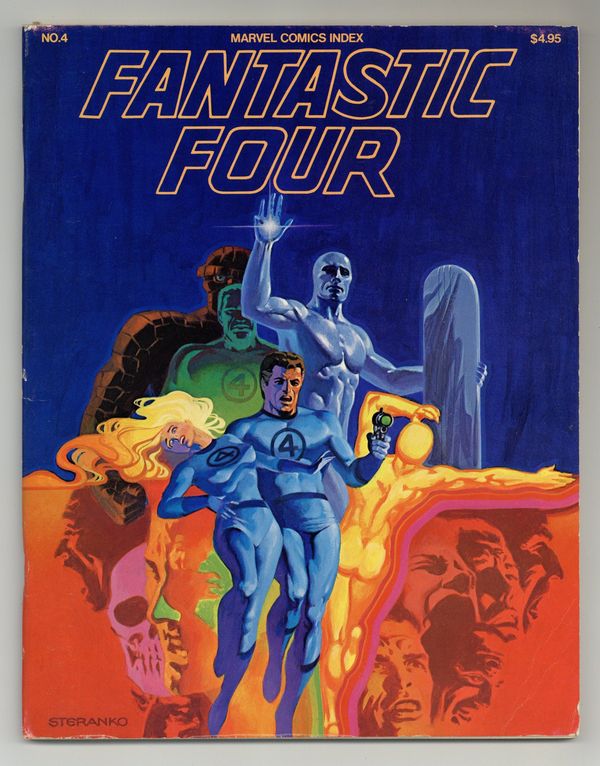 Magazine series devoted to indexing Marvel Comics Series with synopsis of each title, and info (picture of cover, date, story title, art & writing credits, character appearances and other comments) on each issue of the series. Also Includes a list of crossover appearances. THIS ISSUE covers The Fantastic Four and The Silver Surfer. Jim Steranko cover. Synopsis of Fantastic Four. Notes on Marvel Boy of the 1950's. Daring Mystery Comics # 6, Marvel Boy # 1-2, & Astonishing # 3-6. Fantastic Four # 1-180, Annuals # 1-11, & Giant Size # 1-6. Human Torch # 1-8. Silver Surfer # 1-18. Personnel & Major Character cross reference indexes. Golden Age cover gallery. Cover price $4.95.