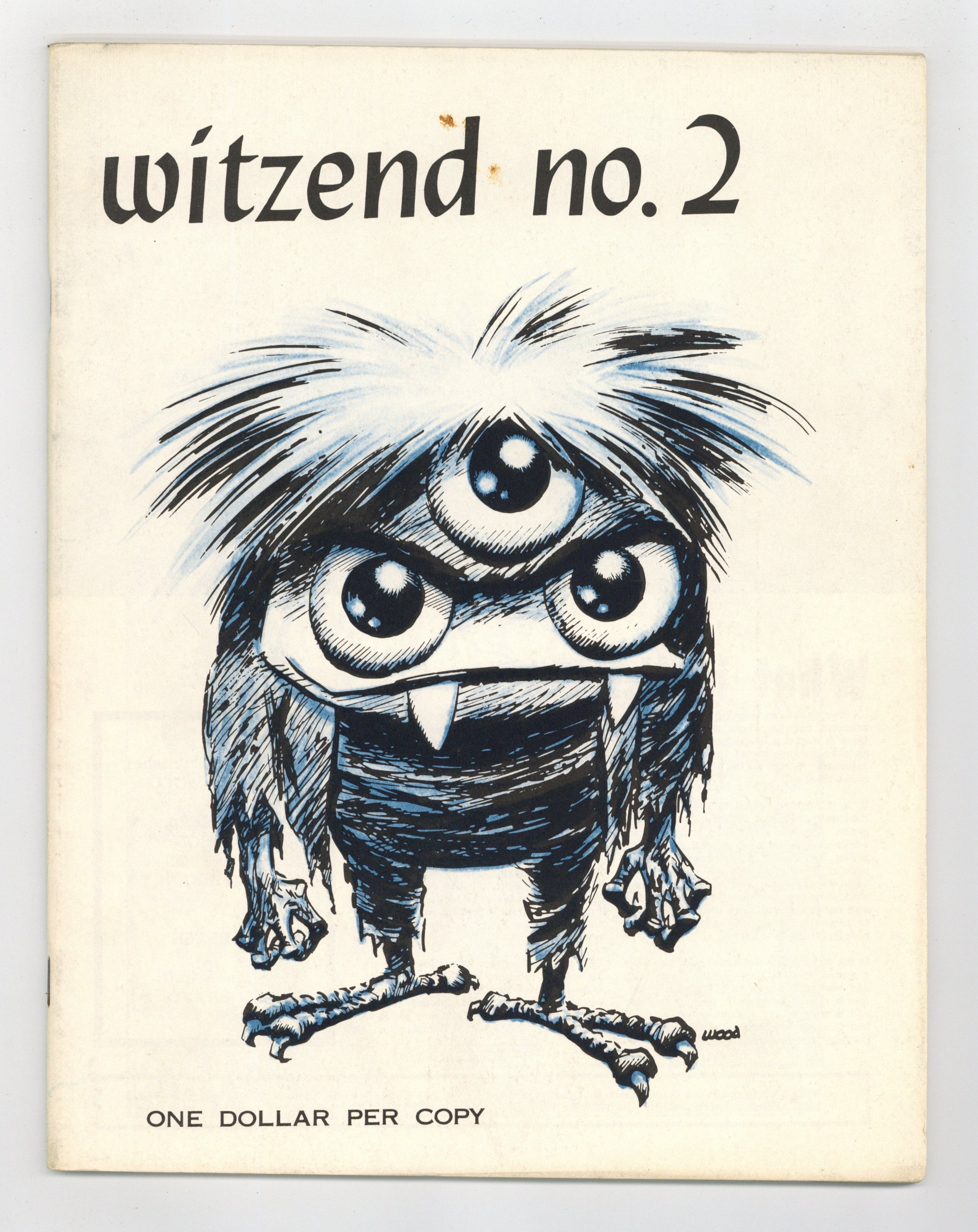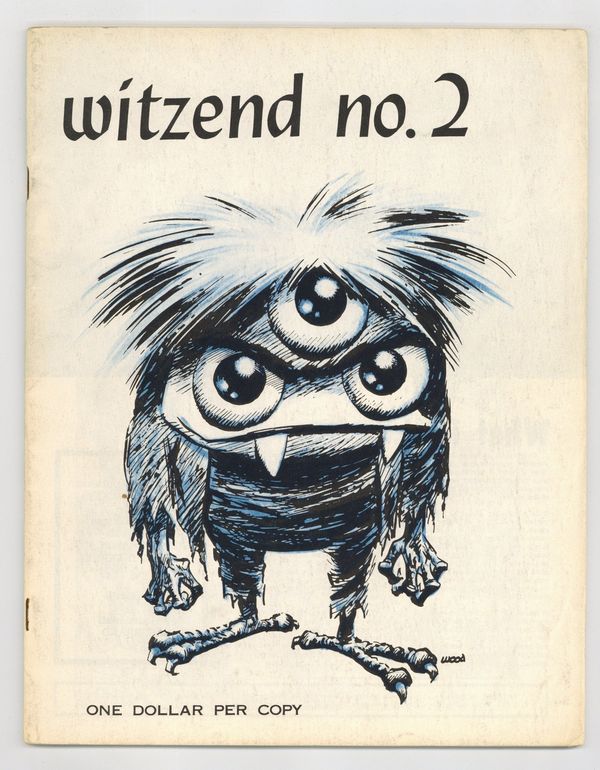 Published by renowned artist Wallace Wood, Witzend is a critically acclaimed fanzine showcasing some of the best artists of the era. Issue #2 includes: Orion (by Gray Morrow), Hey Look (by Harvey Kurtzman), Feeble Fable by Warren Sattler, Edgar Rice Burroughs portfolio by Reed Crandall, illustration by Frank Frazetta, cartoon by Will Elder, 3-page comic story by Art Spiegelman, 1-page comic by Steve Ditko, 2-page comic by Don Martin, illustration by Al Williamson, 2 illustrations by Roy Krenkel, and Animan by Wood. Front cover by Wood. Back cover by Ralph Reese. 8.5 x 11 in.; black and white; 36 pages. Cover price $1.00.
