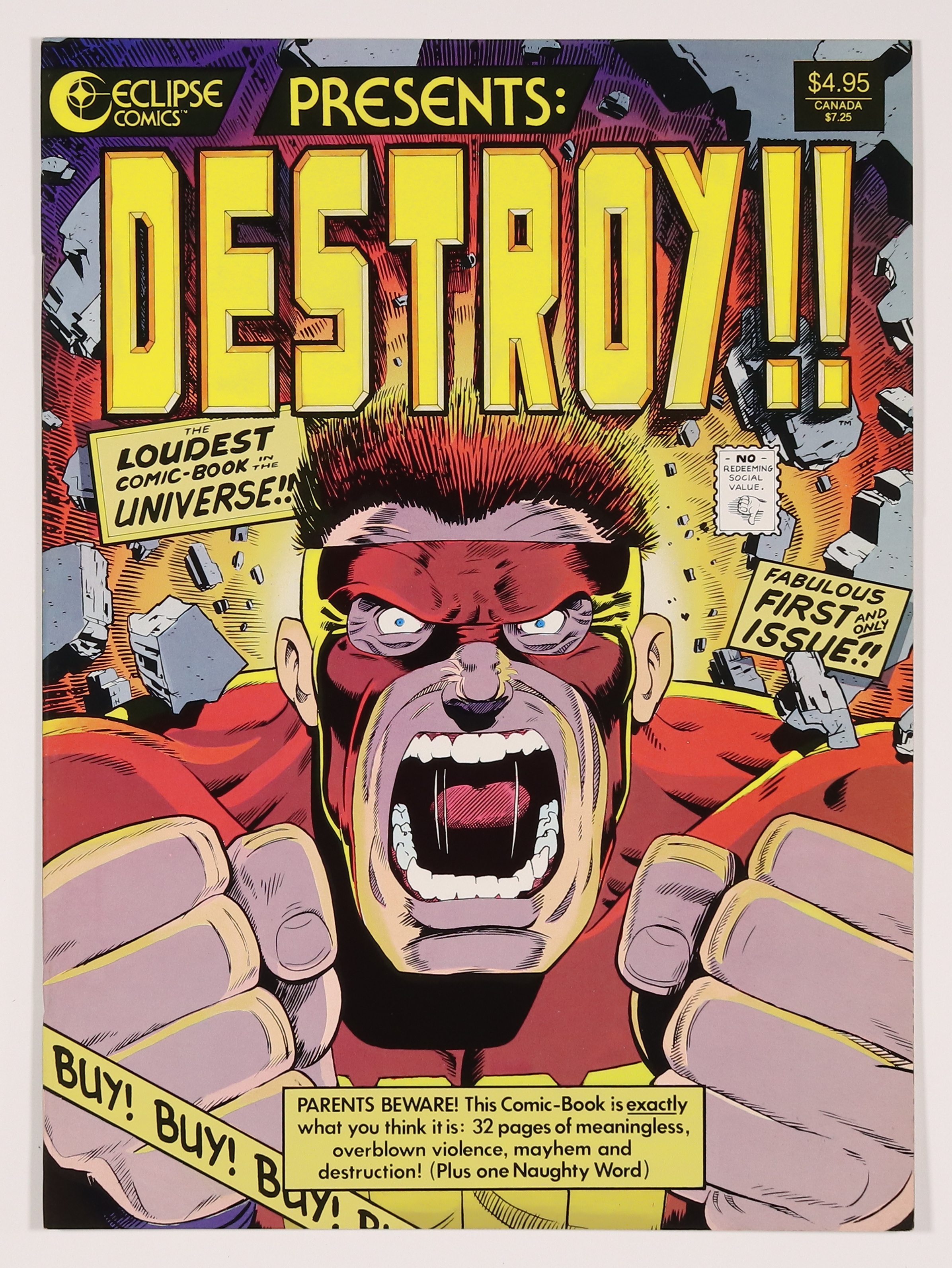 $15.00One-shot written and drawn by Scott McCloud (Zot!, Understanding Comics). DESTROY!! is a parody of superhero comics, a tribute to the big action panels of Jack Kirby, and a forerunner of the "meaningless, overblown violence, mayhem and destruction" that defined the 1990s Image-era of comics. 11 in. x 15 in.; black and white; 32 pages. Cover price $4.95.
