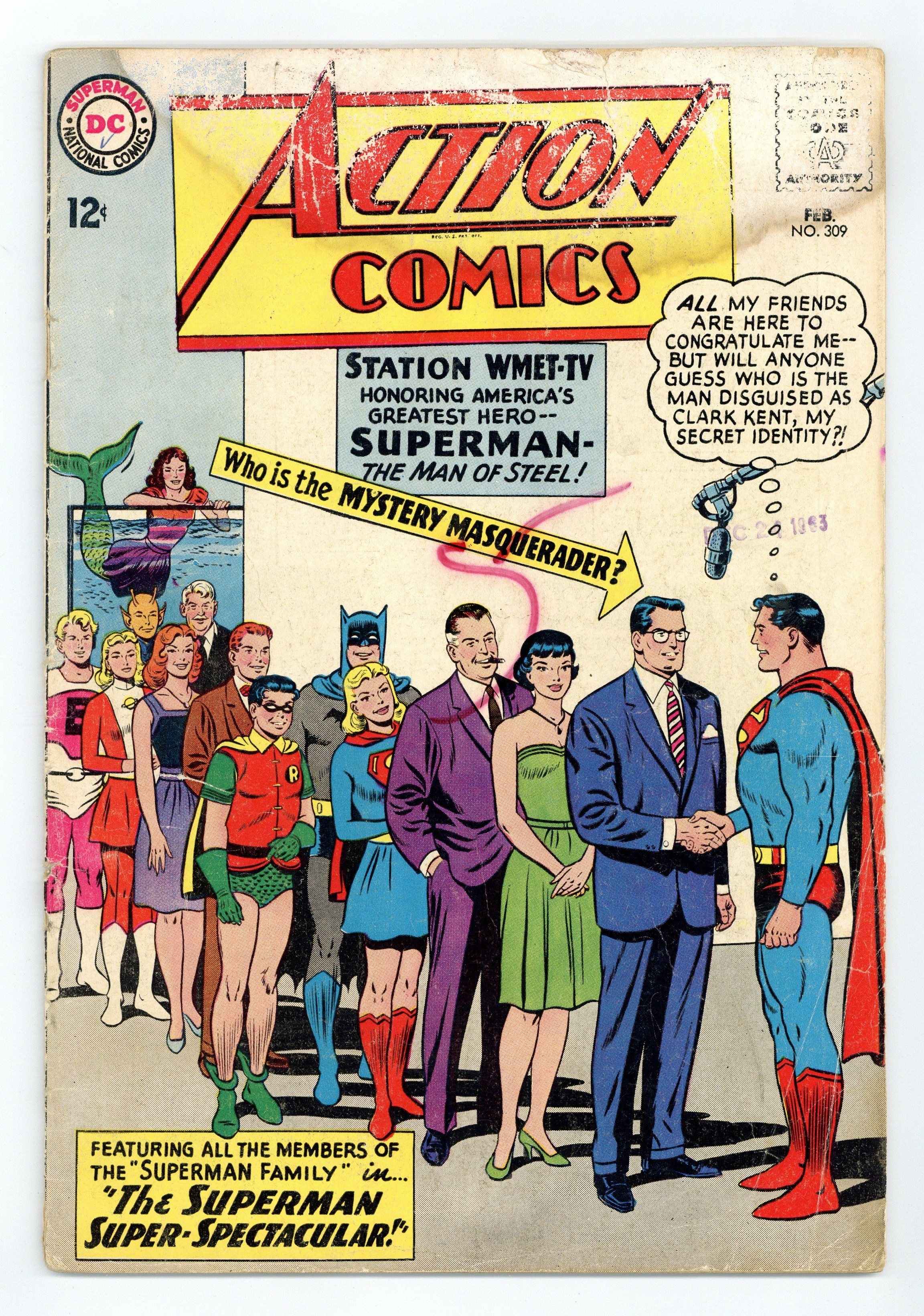 Cover pencils by Curt Swan, inks by Sheldon Moldoff. John F. Kennedy appears in "The Superman Super-Spectacular!", script by Edmond Hamilton, pencils by Curt Swan, inks by George Klein; The television show "Our American Heroes" gathers many of Superman's friends for a surprise tribute; Lois and Lana are sure that Clark Kent will not appear; Later, Superman thanks President John F. Kennedy for disguising himself as Clark; cameo appearances by Batman, Robin, and the Legion of Super-Heroes.. One-page Super-Turtle story by Henry Boltinoff. "The Untold Story of Argo City!", script by Leo Dorfman, art by Jim Mooney; Supergirl learns that her parents survived the destruction of Argo City and that they are still alive in the Survival Zone, though she cannot reach them. 36 Pages, Full Color. $0.12 Cover price $0.12.
