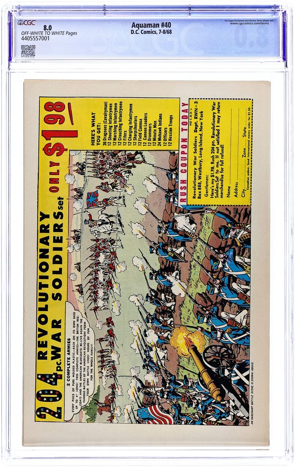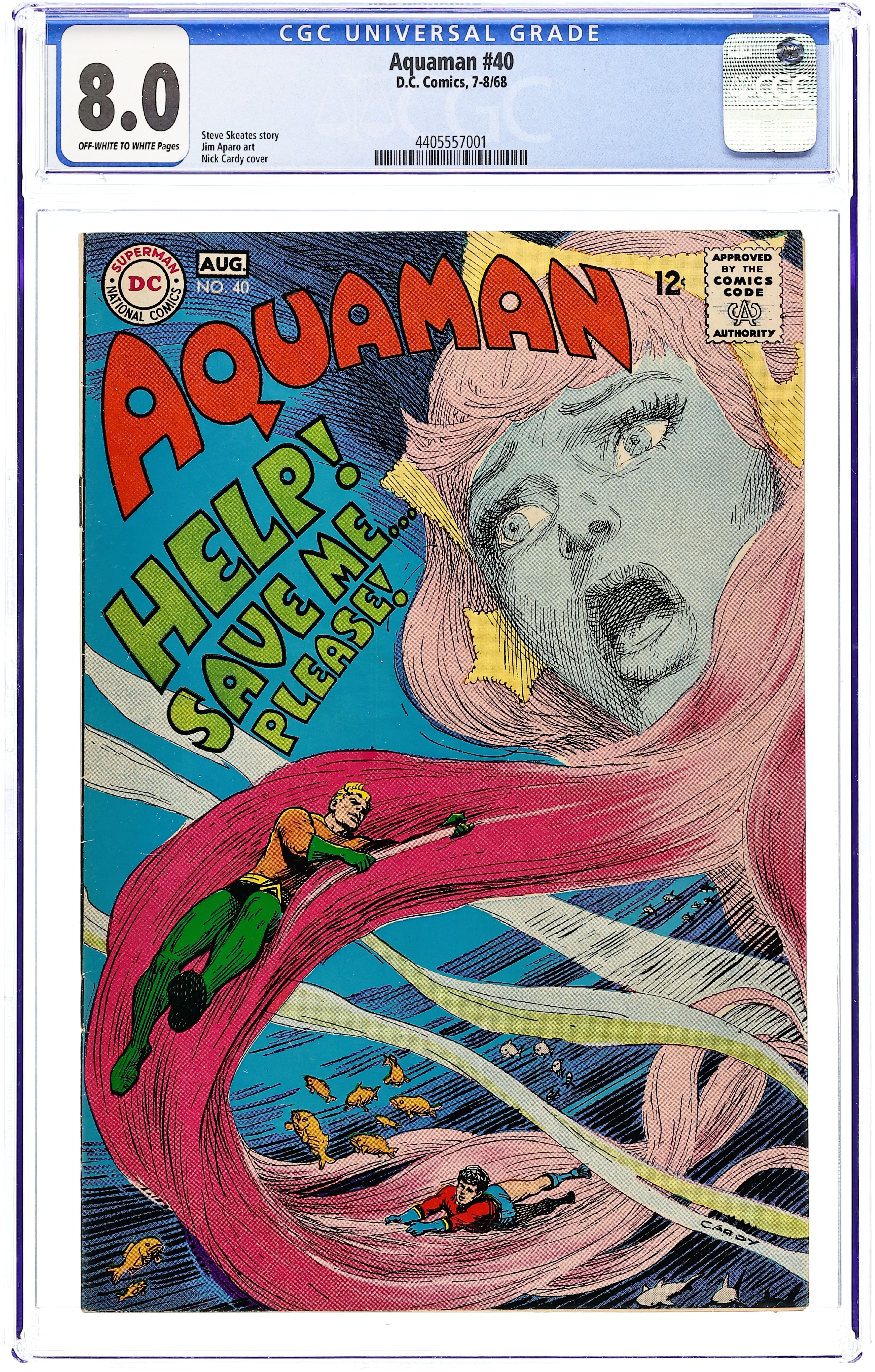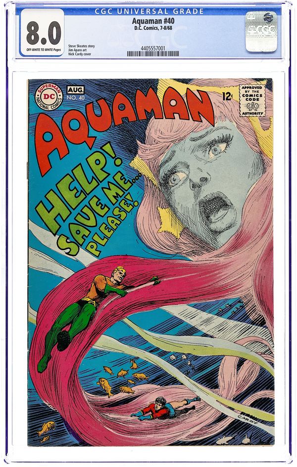 $35.00Cover art by Nick Cardy. Sorcerers of the Sea starring Aquaman, Aqualad, Mera, Aquagirl, Aquababy, Vulko, and The Sea Sorcerers, script by Steve Skeates, art by Jim Aparo (1st for DC); Mera kidnapped, multi-issue quest for Mera begins; story continues in Aquaman #41. Cap's Hobby Hints activity half-page by Henry Boltinoff. 36 pgs. $0.12. Cover price $0.12.