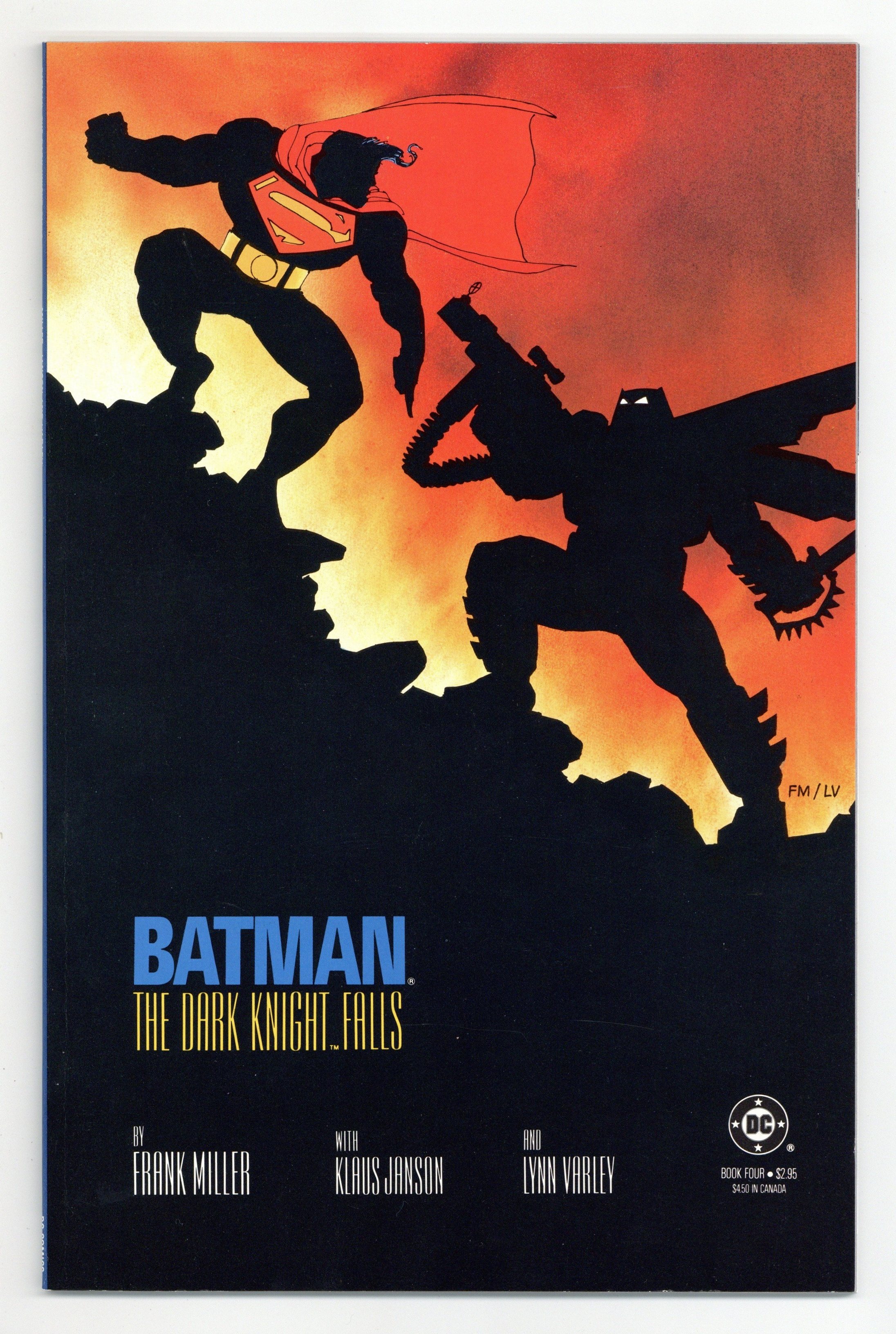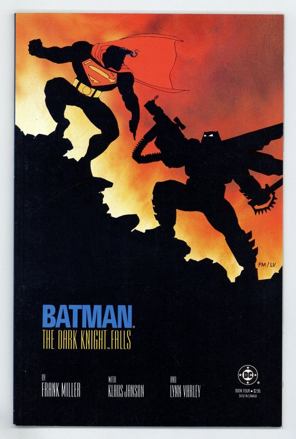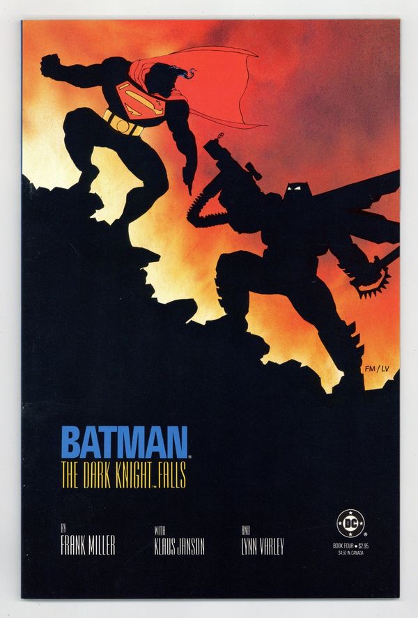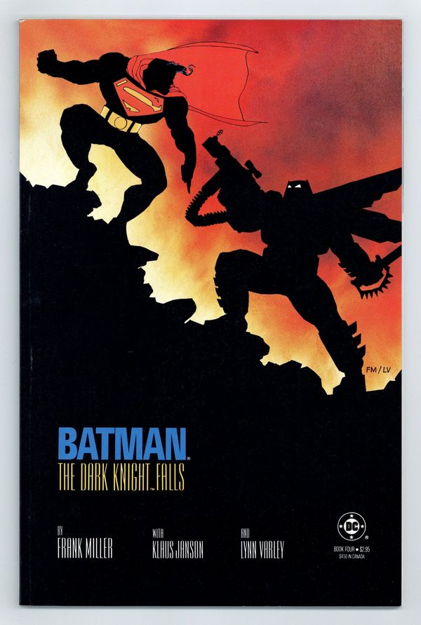Starts Apr 4 1st printing. NOTE: 2nd printings are labeled as such on the inside cover. Cover by Frank Miller. "The Dark Knight Falls," script by Frank Miller, pencils by Frank Miller, inks by Klaus Janson; Russia launches a nuclear warhead called Coldbringer in response to Superman's presence in Corto Maltese; Superman diverts the missile to an uninhabited desert area; The warhead was designed to disrupt electronics and communications and throw dust and debris into the atmosphere; Deprived of sunlight, Superman nearly dies; Gotham descends into chaos; Some citizens, including Jim Gordon, pull together to fight the fires and retain some semblance of civilization until the power is restored; Batman battles the Joker and the police; The U.S. government sends Superman to take the Dark Knight down; Oliver Queen, the former Green Arrow, prepares Batman for his ultimate battle. 52 pgs., full color. Cover price $2.95.