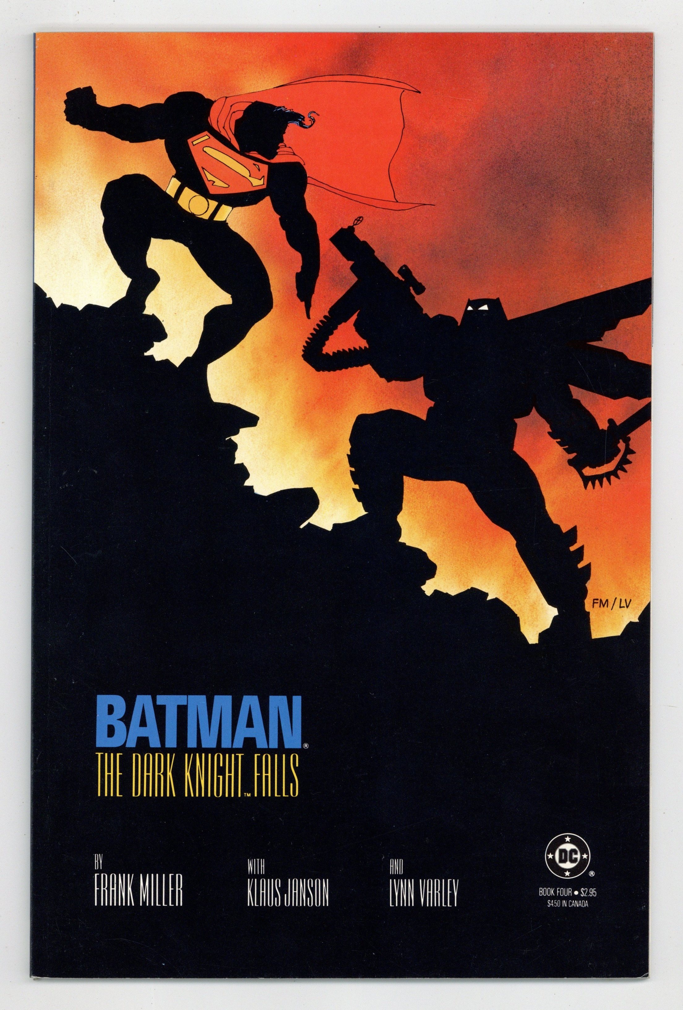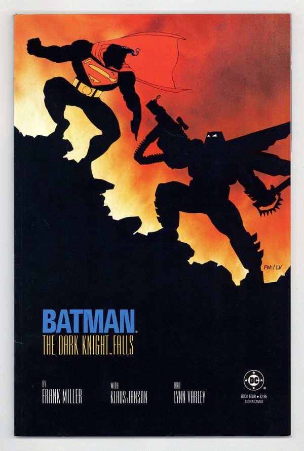 1st printing. NOTE: 2nd printings are labeled as such on the inside cover. Cover by Frank Miller. "The Dark Knight Falls," script by Frank Miller, pencils by Frank Miller, inks by Klaus Janson; Russia launches a nuclear warhead called Coldbringer in response to Superman's presence in Corto Maltese; Superman diverts the missile to an uninhabited desert area; The warhead was designed to disrupt electronics and communications and throw dust and debris into the atmosphere; Deprived of sunlight, Superman nearly dies; Gotham descends into chaos; Some citizens, including Jim Gordon, pull together to fight the fires and retain some semblance of civilization until the power is restored; Batman battles the Joker and the police; The U.S. government sends Superman to take the Dark Knight down; Oliver Queen, the former Green Arrow, prepares Batman for his ultimate battle. 52 pgs., full color. Cover price $2.95.