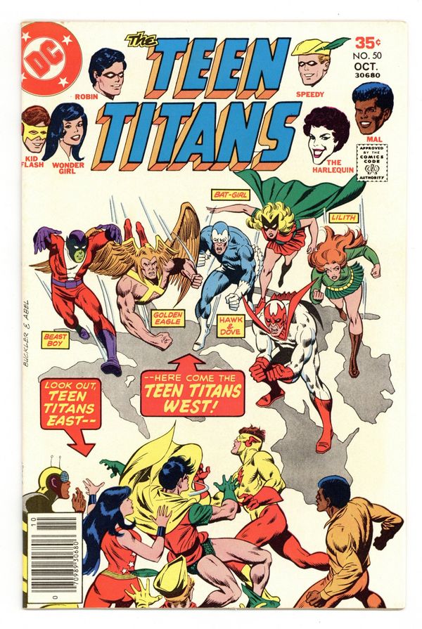 Tags: Teen Titans$23.501st revival original Bat-Girl. Written by Bob Rozakis. Art by Don Heck and Joe Giella. Cover by Rich Buckler and Jack Abel. On the East Coast the Titans stop a runaway train and run into Captain Calamity while on the west coast a floating aircraft carrier brings several costumed heroes running, and they meet after saving the carrier. Hostess ad with Wonder Woman, pencils by Curt Swan, inks by Vince Colletta. Ask the Answer Man column by Bob Rozakis. 36 Pages, Full Color. Cover price $0.35.