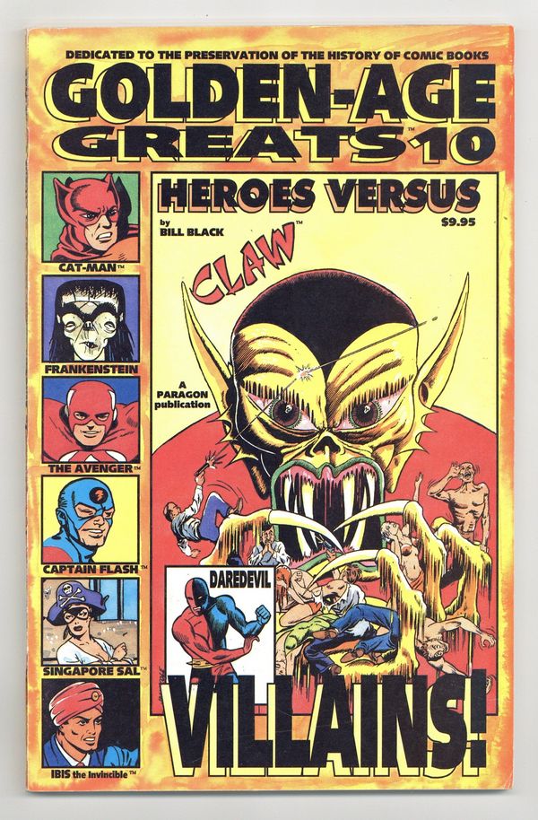 All reprints: "Cat-Man" (art by Max Elkans, from Cat-Man 32); "Captain Flash" (art by Mike Sekowsky, from Captain Flash 1); the Avenger in "The Playtime Perils!" (art by Bob Powell, from the Avenger 4); Crimebuster in "Iron Jaw's Twin" (art by Hi Mankin, from Boy Illustories 79); Ibis the Invincible in "The Menace of Gog and Magog"; Frankenstein in "Bulldog Denny" (art by Dick Briefer, from Prize Comics 13); Don Winslow in "The Return of Singapore Sal" (pencils by Carl Pfeufer, inks by John Jordan, from Don Winslow of the Navy 51); Daredevil in "The Claw" (art by Jack Cole, from Silver Streak Comics 10); and Supermouse in "The Deep Freezer Squeeze!" (from Super Mouse Summer Giant 2). Cover price $9.95.