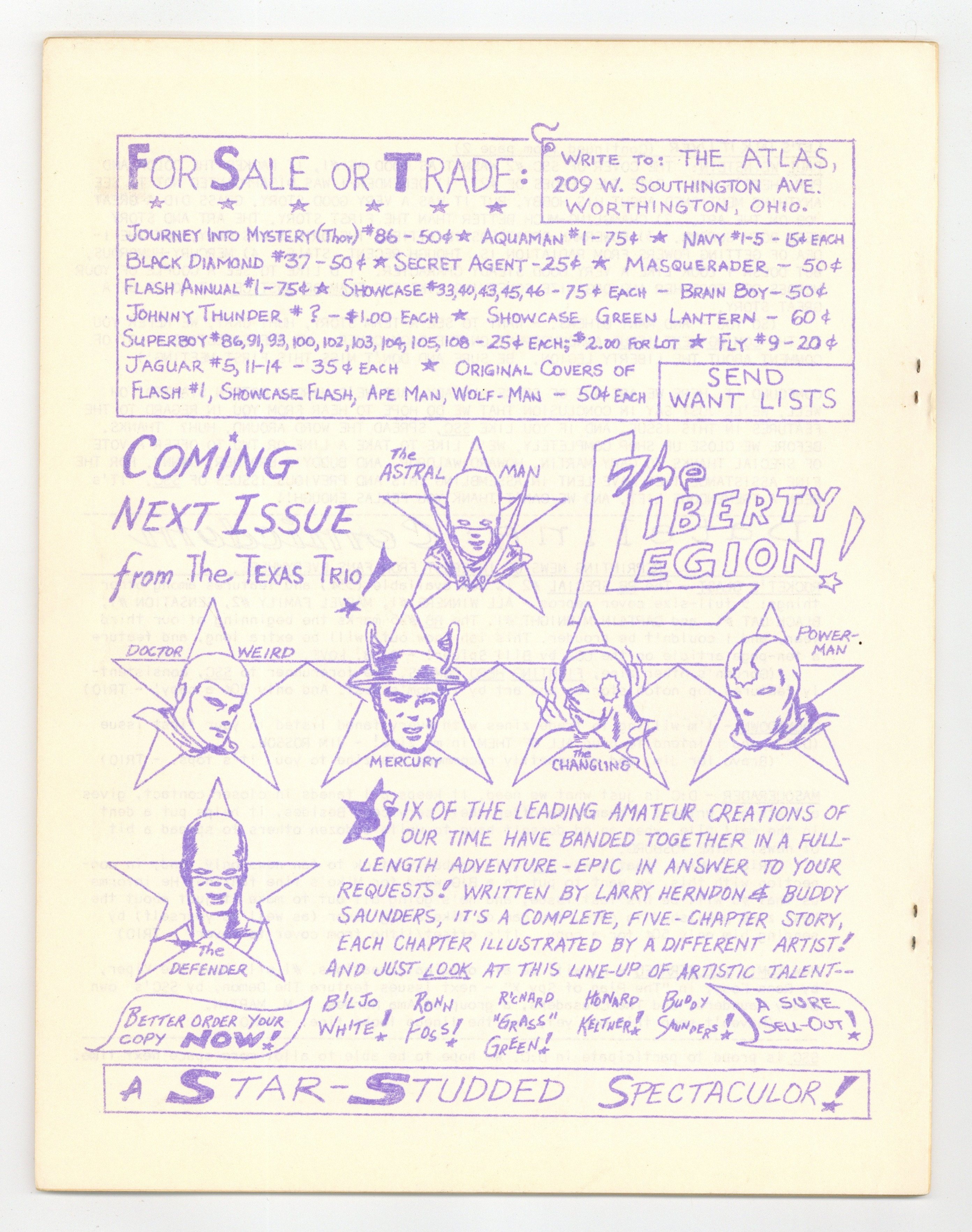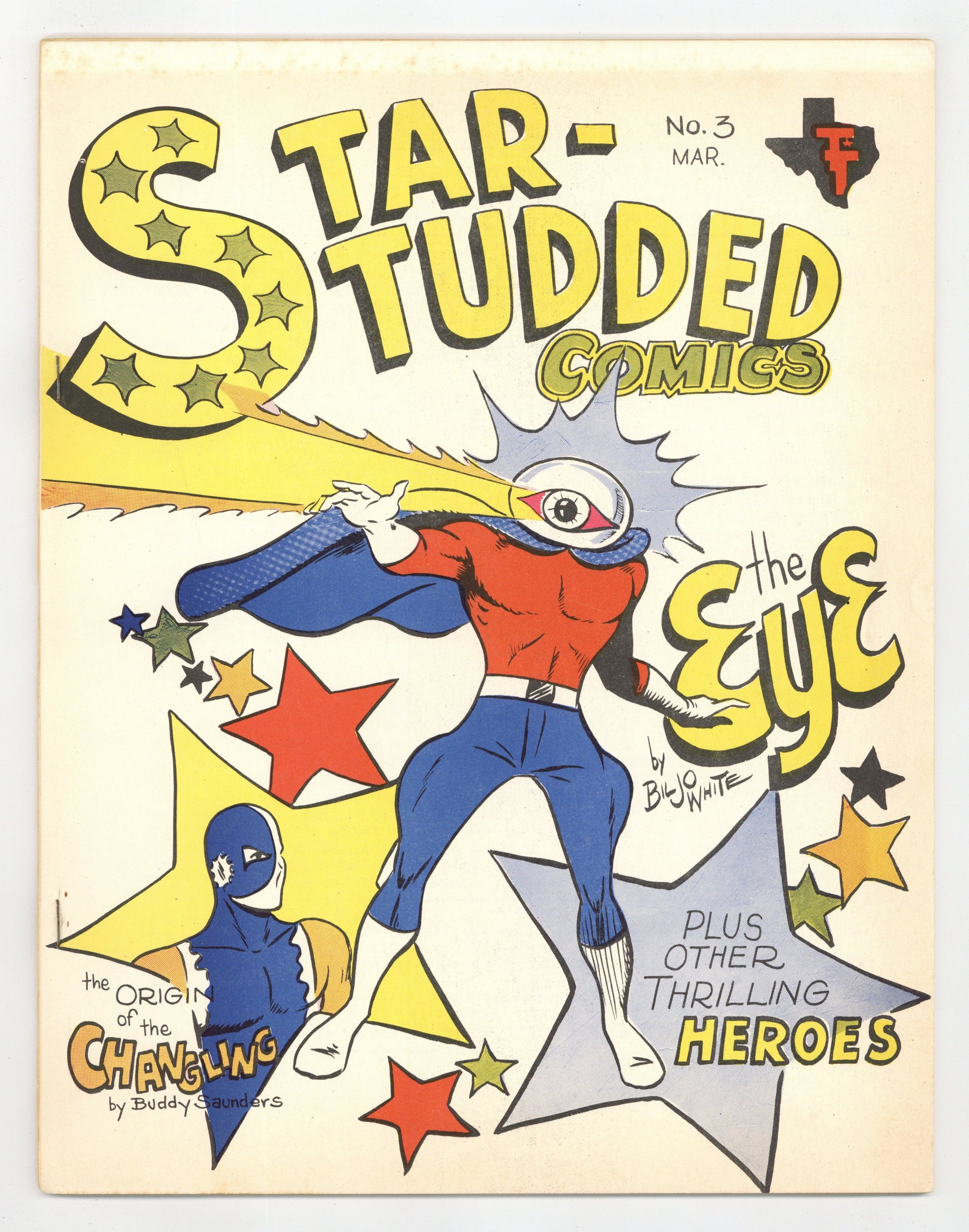 Star-Studded Comics 3 - March 1964 Format: Four-color photo offset for cover and ditto interior Staple bounded on sides of pages Original price was 35 cents Color cover by Biljo White features the Eye and the Changling "Let's Talk It Over!" column notes that circulation of this issue was 250 copies and has letters from Tom McGeehan, Steve Hayward, Joe Byrne, Paul Gambaccini, and Paul Weinstein. Issue has advertisements for other comic fandom publications. Also has an advertisement of comics "for sale or trade" and includes Aquaman #1 for 75 cents, Flash Annual #1 for 75 cents, Showcase Green Lantern for 60 cents, Journey Into Mystery #86 (Thor) for 50 cents. Stories:"Introducing The Eye" A comic story with script and art by Biljo White "The Origin of the Changling" A text story by Buddy Saunders "Mr. Mystic" A text story by Robert Butts and illustrations by Howard Keltner Some pages to this story are single sided. "The Blue Streak in Ride A Deadly Missile" A comic story by Ken "Kente" Tesar. Some pages to this story are single sided Cover price $0.35.