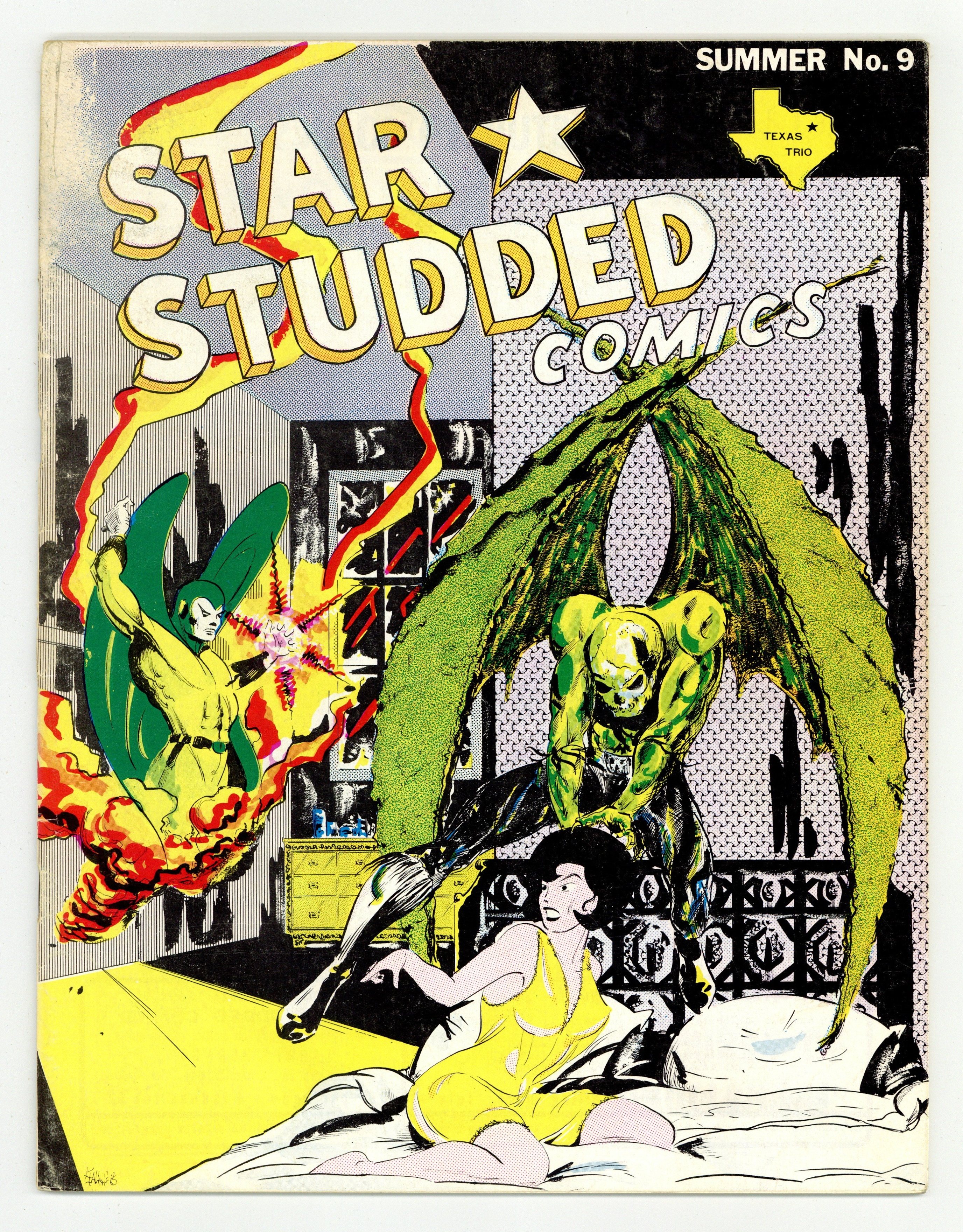Star-Studded Comics 9 - Summer 1966 Format: Photo offset printing Wrap-around binding with staples in center. Original price was 50 cents Color cover by Buddy Saunders features Doctor Weird. Back cover by D. Bruce Berry for Vale Proditor! "Let's Talk It Over!" notes print run of this issue was 500 copies. "From Our Readers" features letters from Dennis Richard, John Melvin, Landon Chesney, John Wright, George R.R. Martin, Dave Bibby, and William C. Lee. Full page ad for audio tapes of a Captain Marvel serial, the Superman Broadway play, and the Mad Magazine Broadway play. Stories:Dr. Weird in "The Curse of Skullwing!" Comic story with script by Larry Herndon and art by Alan Weiss Powerman versus "The Transmuter" Comic story with script by Dave Bibby and art by Bill Dubay Vale Proditor! Text story by Howard Waldrop and illustrations by Buddy Saunders. Today Waldrop is a noted science fiction writer. This was possibly his first published story. Xal-Kor the Human Cat in "A Friend in Need!" Comic story with script and art by Richard "Grass" Green Cover price $0.50.