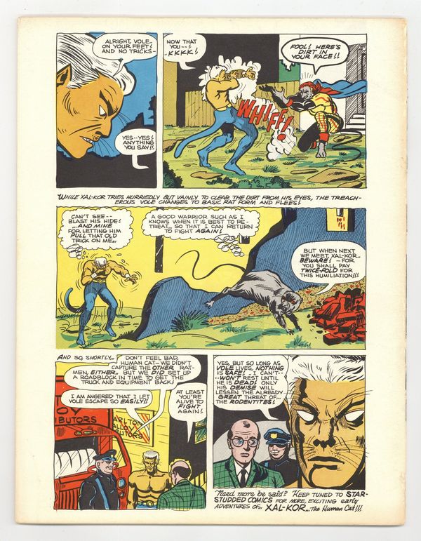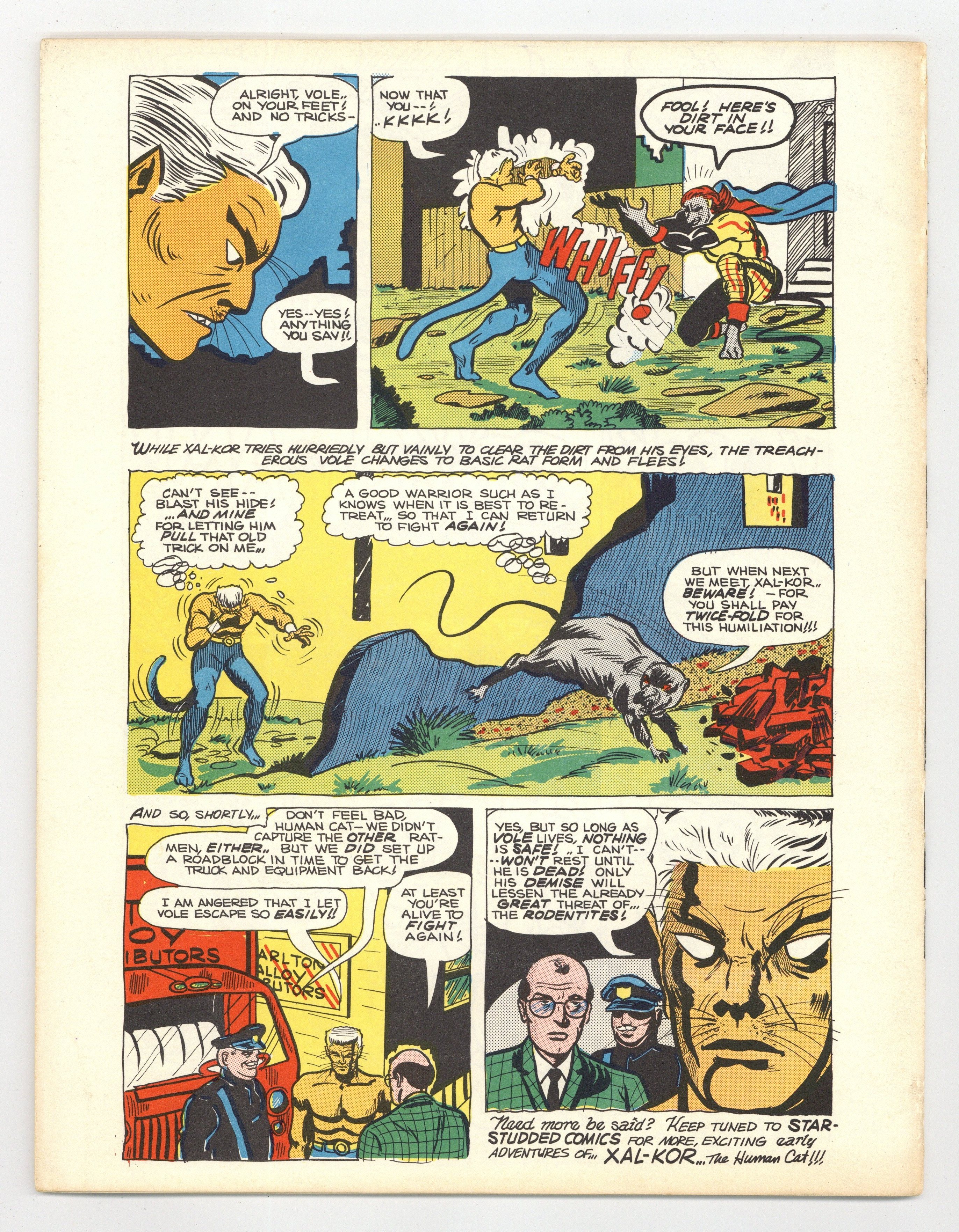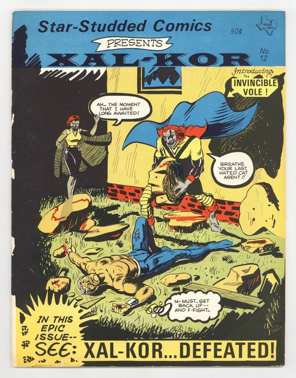 Star-Studded Comics 12 - Winter 1967 Format: Offset/Lithograph process Wrap-around binding with staples in center. Original price was 50 cents Color cover by Richard "Grass" Green features the Xal-Kor the Human Cat. Back cover features last page of story in color. "Let's Talk It Over!" column notes that this issue's print run was 500 copies and has letters from Gordon Flagg Jr., Craig Yoe, John Ryan, and Dave Bibby. Column also has an announcement that the Southwestern Con 1968 will be held in Dallas on June 21-23, 1968. This issue also features a detailed article and photos on the Houston Con 1967 - the second comic convention held in Texas. Stories:A four-part epic tale of Xal-Kor the Human Cat. This is the only issue of Star-Studded Comics to feature a book-length tale of one super-hero - Xal-Kor Versus The Invincible Vole!" Part 1 - "The Origin of the Invincible Vole!" Story by Richard "Grass" Green. Art by Richard "Grass" Green and Landon Chesney Part 2 - "Xal-Kor...Defeated!" Story by Richard "Grass" Green and art by Richard Buckler Part 3 - "At Death's Door..." Story and art by Richard "Grass" Green Part 4 - "The Tide Turns!" Story and art by Richard "Grass" Green Cover price $0.50.