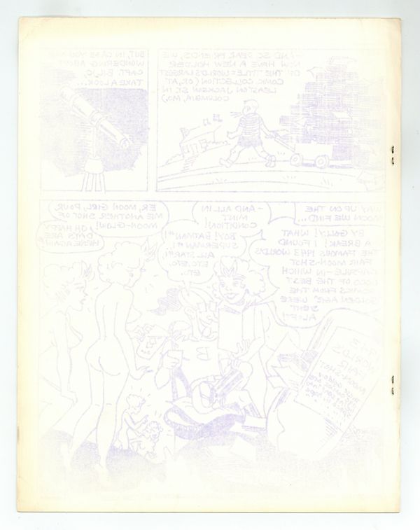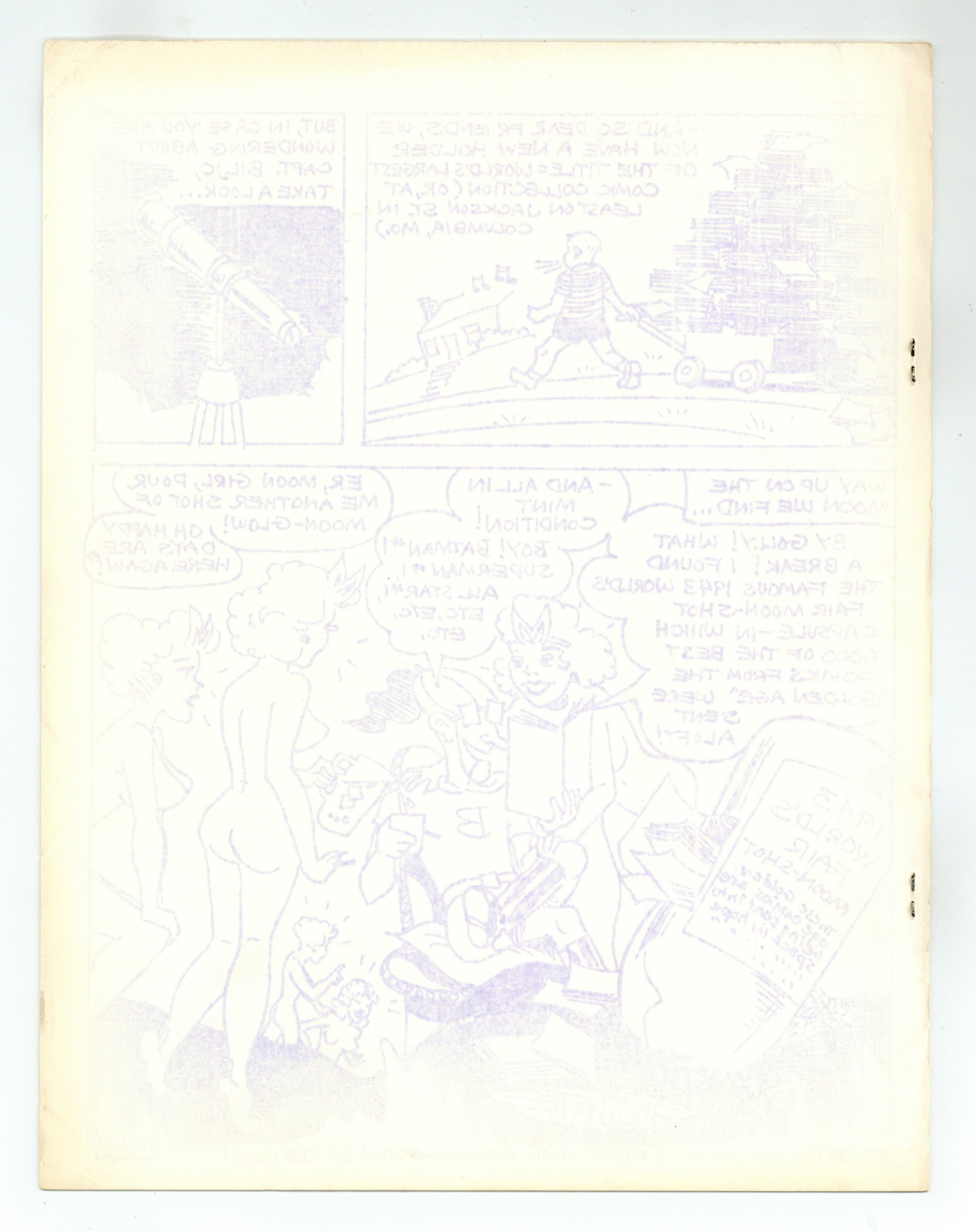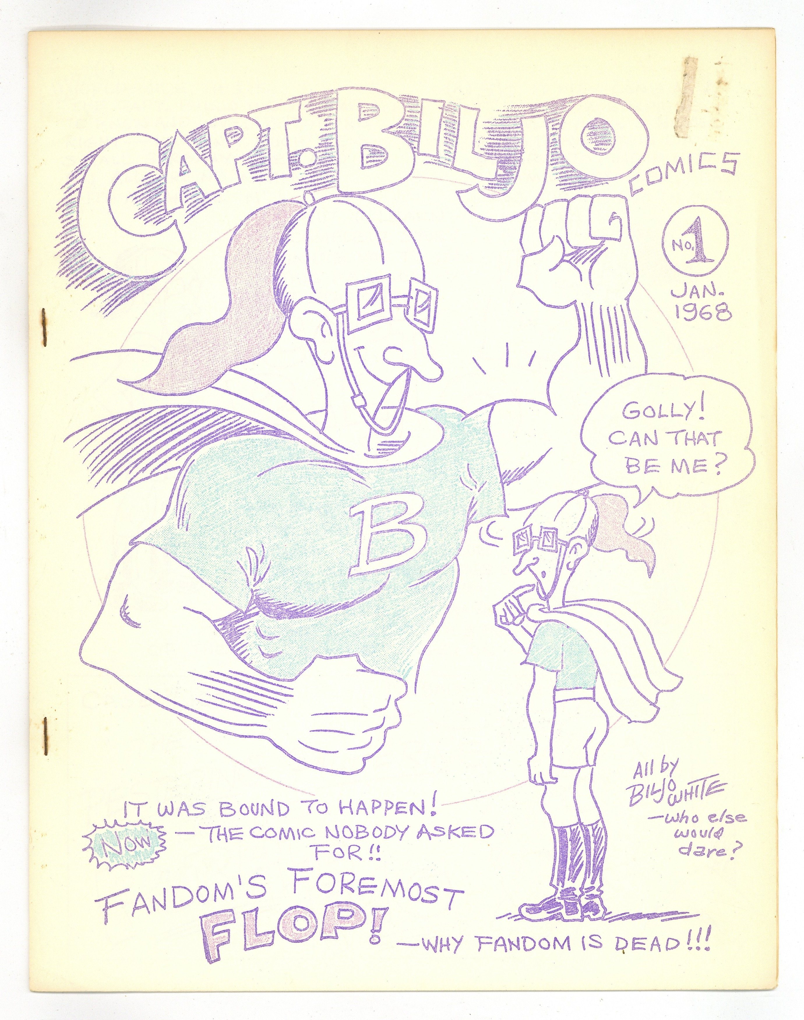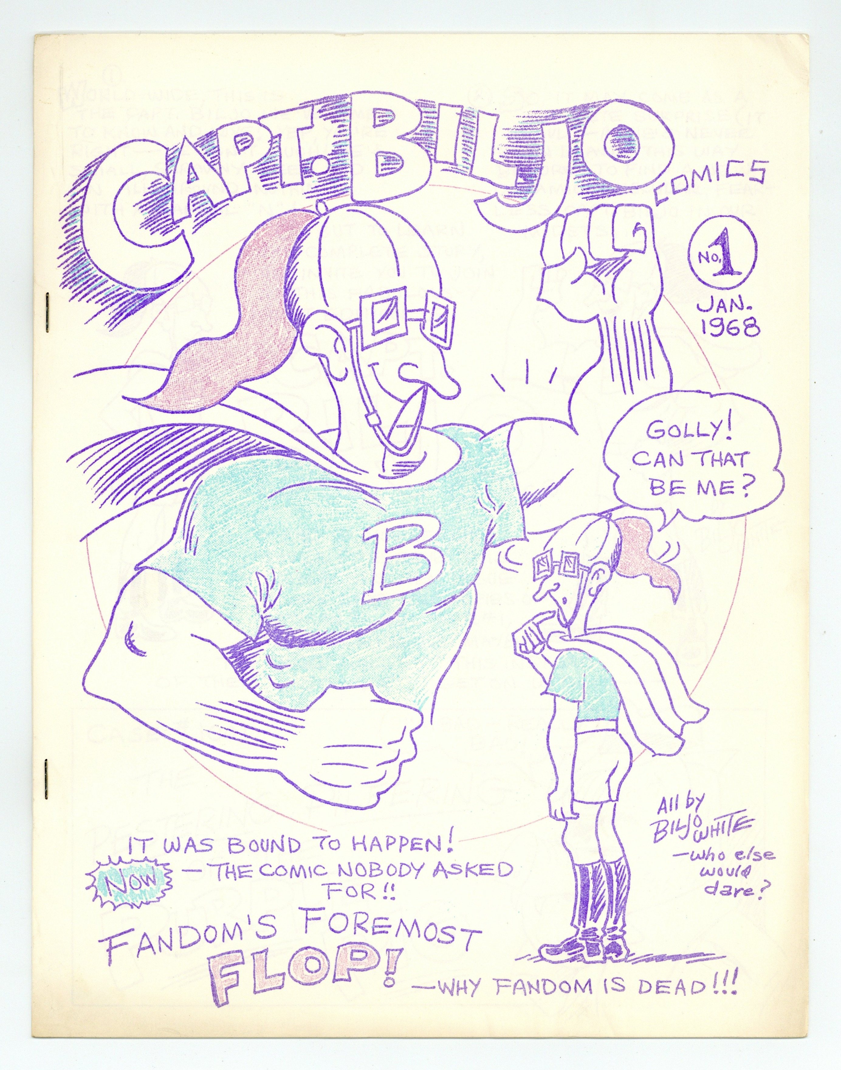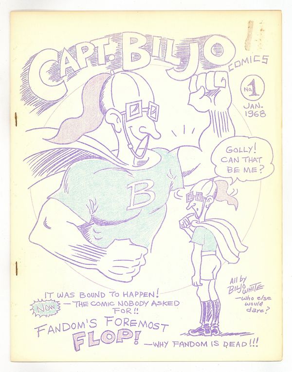 Capt. Biljo Comics was published during the Golden Age of comic book fanzines by William J. White, a prominent fan who frequently went by the nickname of Biljo White. Issue #1 features cover art by White, plus a strip-ed called "The Pestering Pilfering of the Purple Pig." 14 pgs. Ditto. Jan., 1968.