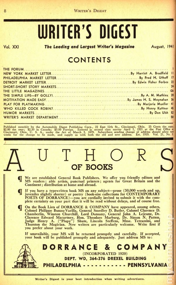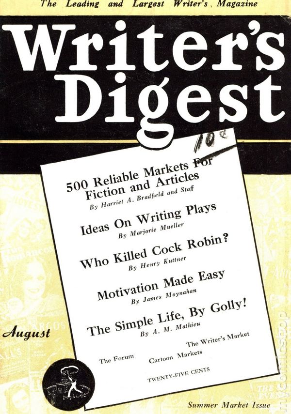 August 1941. "500 Reliable Markets For Fiction and Articles" by Harriet A. Bradfield, "Ideas On Writing Plays" by Marjorie Mueller, "Who Killed Cock Robin" by Henry Kuttner, "Motivation Made Easy" by James Moynahan, and "The Simple Life, By Golly!" by A.M. Mathieu. 64 Pages, B&W, 6.5" x 9.5". Cover price $0.25.