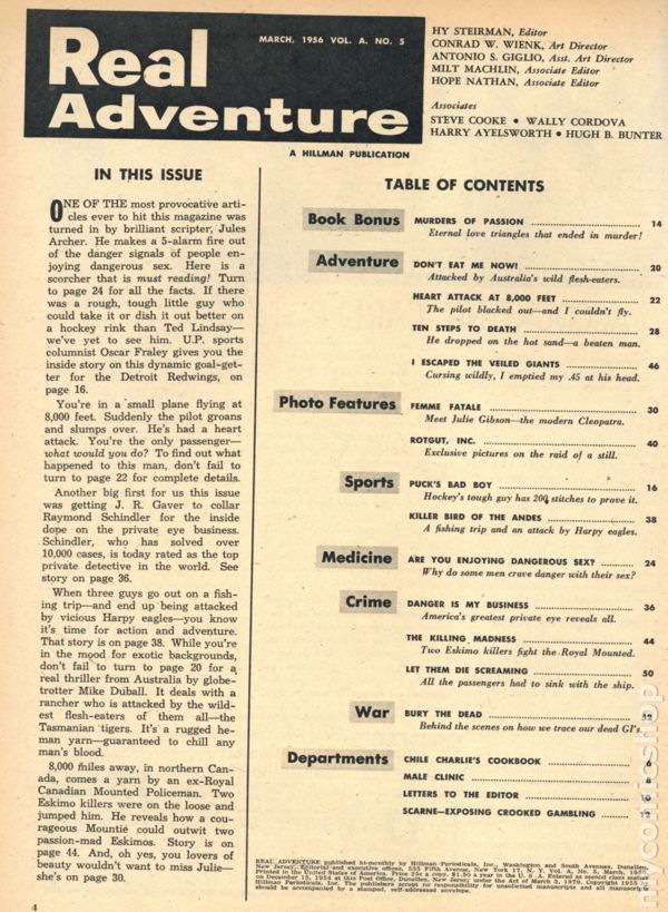 Volume A, Issue 5 - March 1956. Men's interest magazine featuring adventure stories and photos of buxom bombshells."Murders of Passion"."8 1/2-in. x 11-in. B&W. Cover price $0.25.