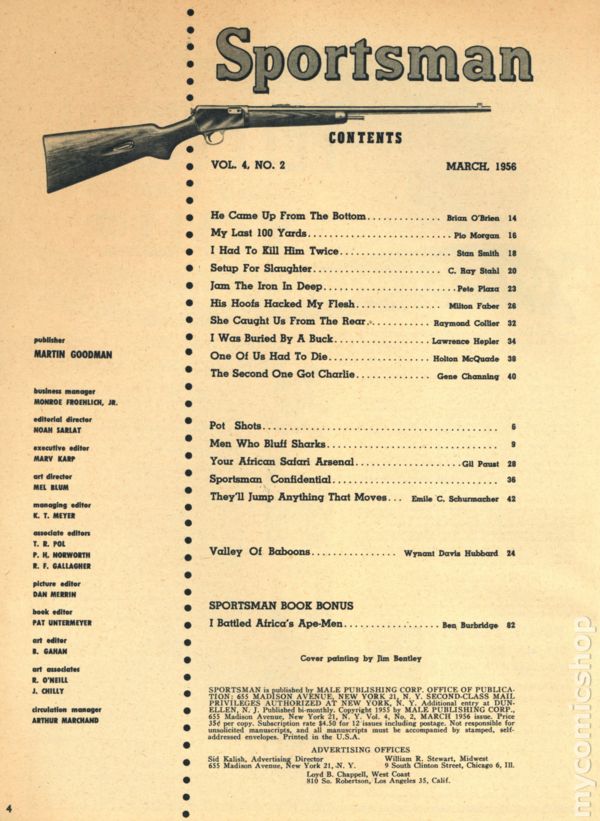 Volume 3, Issue 1 - March 1956. Cover by Morton Kuntsler. Men's interest magazine focusing on hunting, fishing, and fitness articles. 8 1/2-in. x 11-in., 98 pages, B&W Cover price $0.35.