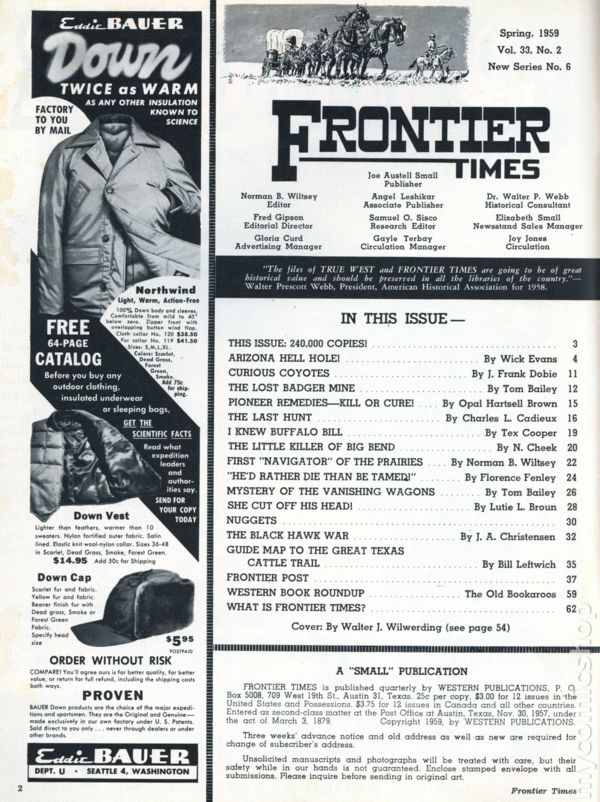 Magazine of true stories of the American Frontier. Features illustrations and photos of the old west. B&W text. Color cover. 8 1/2-in. x 11-in. 64 pages. Cover price $0.25.