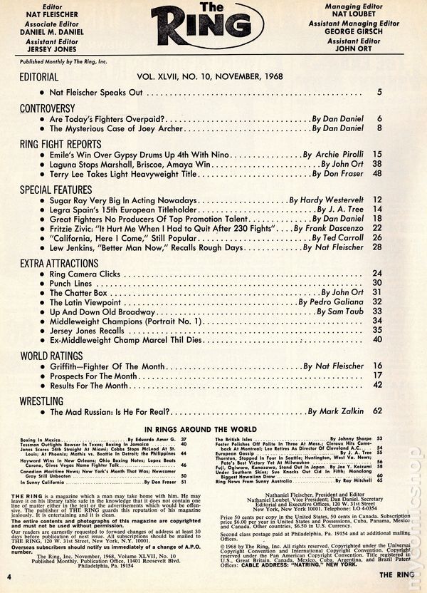 Vol. 47 #10 - Nov. 1968. Boxing magazine. Features articles, departments, ratings, fight reports around the world and more. 8 1/4-in. x 10 3/4-in., 66 pages, B&W. Cover price $0.50.
