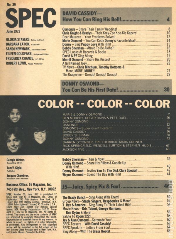 Issue #39. June 1972. Fan magazine aimed at teen girls. Coverage of the Osmonds, Jackson 5, David Cassidy, and more. 8.25" x 11". 66 pages. Black and white with a few color pages. Cover price $0.35.