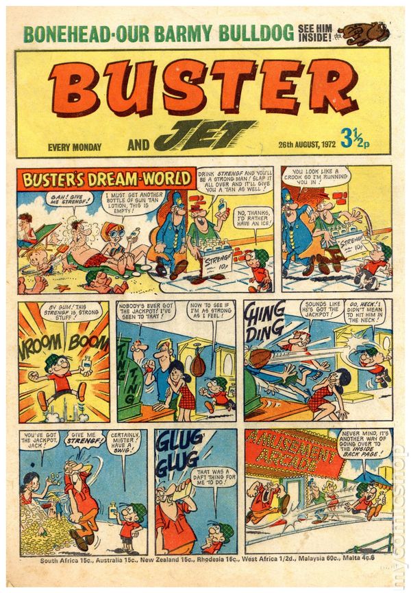 British weekly humor comic featuring such characters as Gus Gorilla, the Gasworks Gang, Donovan's Dad, Percy Puffer, Robot Maker, Tricky Dicky and more. 8-in. x 11 1/2-in., 32 pages, covers and centerfold strip in color, other pages black and white and single color highlight.