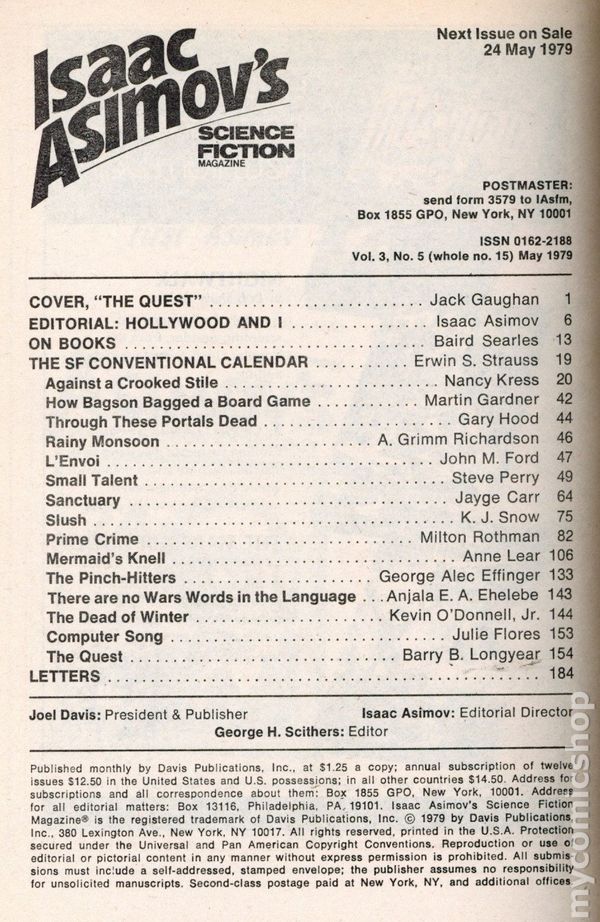 May 1979. Cover by Paul Lehr. Stories: "The Monkeys thought 'Twas all in Fun" by Orson Scott Card, "A Twice-Toed Tale" by George W. Harper, "Old Friends Across Time" by Paul J. Nahin, "Quantum Jump" by M. David Stone, and "Ghostwritten Man" by Eric Vinicoff and Marcia Martin. Science Fact articles: "Twenty Years to Space" by Thomas A. Easton, and "War and Space" by Charles Duelfer. State of the Art article: "Science Fiction and 'Literature' or the Conscience of the King" by Samuel R. Delany. Softcover, 5.25-in. x 7.5-in.; 178 newsprint pages, B&W. Cover price $1.25.