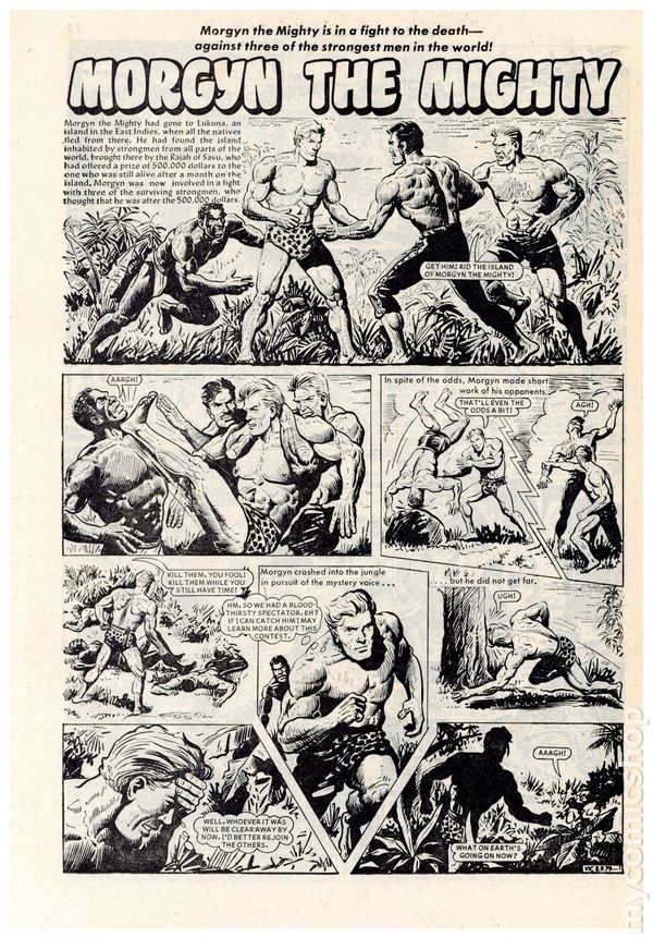 "This Sword for Hire" Script by Mike Grell, art by Grell and Vince Colleta. Cover by Grell. Morgan, who has joined forces with a group of mercenaries, ventures into the Mountains of the Sun, where "legends live and men fear to walk!" Cover price $0.40.