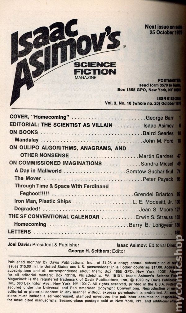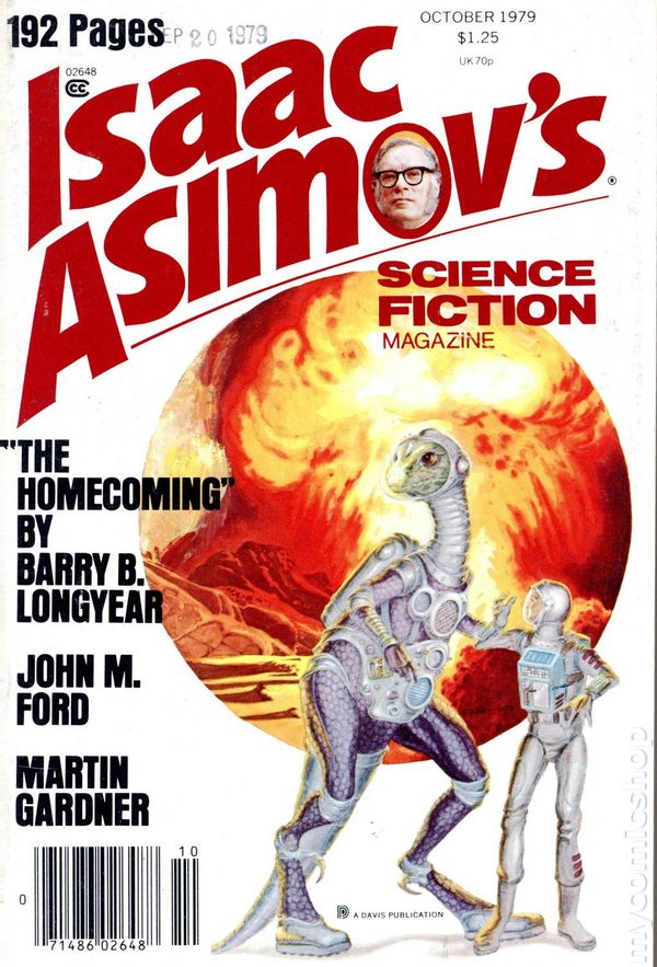 October 1979. Cover by Vincent DiFate. Stories: "The Visitors"(Part 1) by Clifford D. Simak, "The Case of the Disposable Jalopy" by Mack Reynolds, "Instructions Enclosed" by W.T. Quick, and "In Adam's Fall" by Jayge Carr. Science Fact article: "To Jupiter and Beyond" by Walter B. Hendrickson, Jr. Softcover, 5.5-in. x 7.5-in.; 178 newsprint pages, B&W. Cover price $1.25.