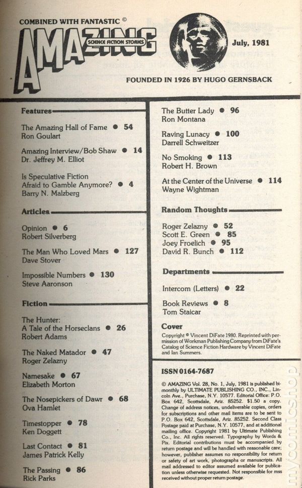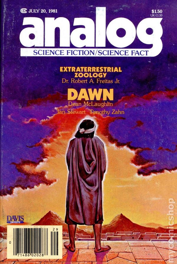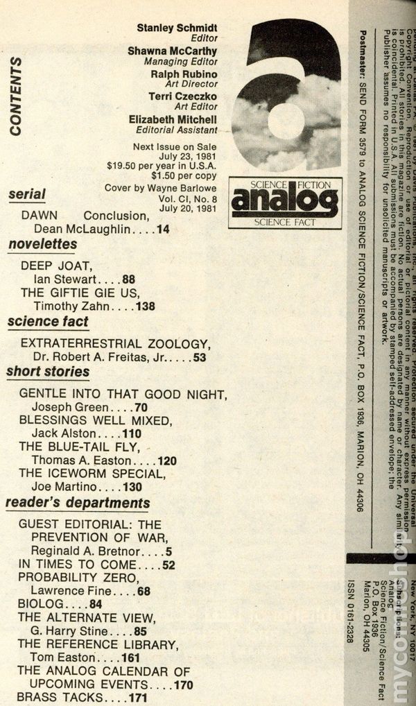 July 1981. Cover by David Hardy. Stories: "Dawn"(Conclusion) by Dean McLaughlin, "Deep Joat" by Ian Stewart, "The Giftie Gie Us" by Timothy Zahn, "Gentle into that Good Night" by Joseph Green, "Blessings Well Mixed" by Jack Alsont, "The Blue-Tail Fly" by Thomas A. Easton, and "The Iceworm Special" by Joe Martino. Science Fact article: "Extraterrestrial Zoology" by Dr. Robert A. Freitas, Jr. Softcover, 5.25-in. x 7.5-in.; 178 newsprint pages, B&W. Cover price $1.50.
