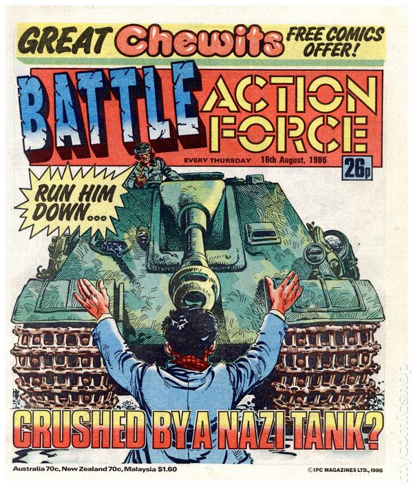 August 16, 1986. Published by IPC Magazines, Ltd. in the U.K. "Tough action war stories every week!" Combined with Valiant (also an IPC publication). 9 x 11 in.; black and white (color centerspread); 32 pages; 26p cover price.
