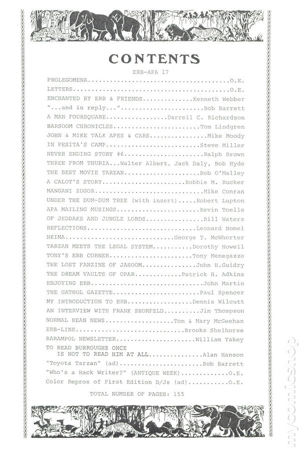 No. 17 - March 31, 1988. Publication of the Edgar Rice Burroughs Amateur Press Association. An APA issue consists of the members individually printed contributions collated together and then sent to each member. Too much information, opinions, gossip, trivia and ephemera to list it all. Velo bound, 8 1/2-in. x 11-in., 182 colored pages.