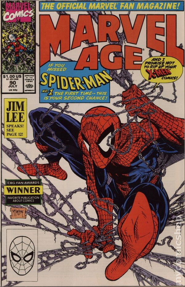 Newsstand Edition. Pro File: Todd McFarlane; interview with Jim Lee on the X-Men; a look at the Foolkiller limited series, with comments from Steve Gerber and Renee Witterstaetter; 'Willie Lumpkin' strip by Stan Lee and Dan DeCarlo; 2-page Fred Hembeck strip; a look at Spider-Man, with comments from Todd McFarlane; 5-page preview of Spider-Man by McFarlane; Marvel Age of Comics: 1981 (Part V); The Many Faces of Daredevil. Spider-Man cover by McFarlane. Cover price $1.00.