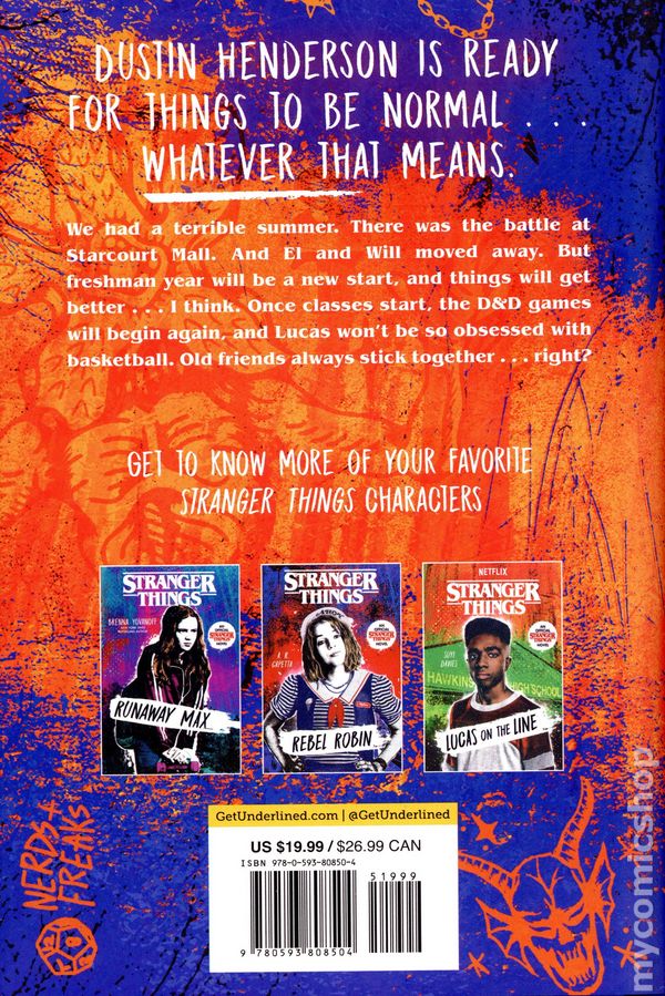 1st printing. By J.L. D'Amato. Follow Stranger Things fan favorite Dustin Henderson on a journey that takes him beyond Hawkins. Its fall 1985, and Dustin Henderson is starting his freshman year at Hawkins High School. After the tragedy at the Starcourt Mall, hes ready for life to return to normal, but things feel different. Some friends have moved away. Others are still in town but growing distant. Dustin thinks entering a science competition will make everything like it used to be, but will Lucas and Mike join him? Or will he have to rely on a charismatic metalhead named Eddie? Join Dustin on a road trip filled with inventions, heavy metal, and a new understanding of his place in Hawkins. Sprinkled with references to your favorite Stranger Things characters, this novel chronicles the events between seasons three and four of Netflixs iconic series. Hardcover, 5-in. x 8-in., 304 pages, Text Only. Cover price $19.99.