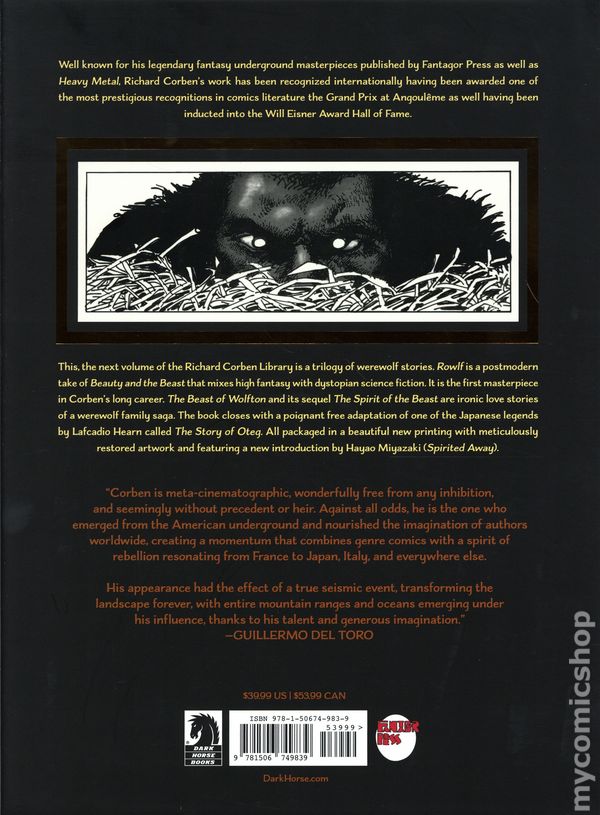 1st printing. Story and art by Richard Corben. Art Restoration by Jose Villarrubia. The next volume of the hardcover Richard Corben Library is a trilogy of werewolf stories. Rowlf is a postmodern take of Beauty and the Beast that mixes high fantasy with dystopian science fiction. It is the first masterpiece in Corben's long career. The Beast of Wolfton and its sequel The Spirit of the Beast are ironic love stories of a werewolf family saga. The book closes with a poignant free adaptation of one of the Japanese legends by Lafcadio Hearn called The Story of Oteg. All packaged in a beautiful new printing with meticulously restored artwork and featuring a new introduction by Hayao Miyazaki (Spirited Away). All presented in a gorgeous hardcover with a dust jacket! Hardcover, 8-in.x 11-in., 128 pages, B&W. Mature Readers Cover price $39.99.