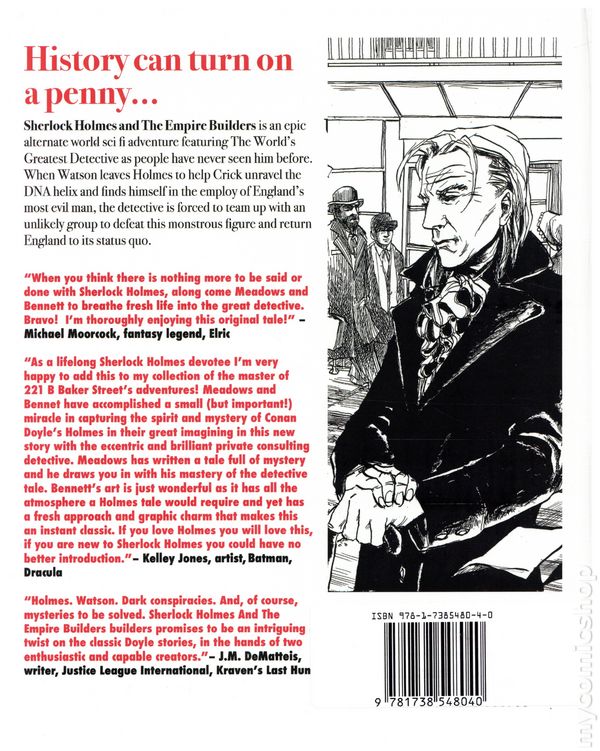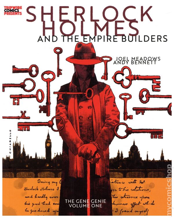 Volume 1 - 2nd and later printings. Written by Joel Meadows. Art by Andy Bennett. Pin-Up Art by Frazer Irving, Barry Kitson, Liam Sharp, Bill Sienkiewicz, Shawn Martinbrough, David Hitchcock, and Andy Bennett. Cover by Mark Chiarello. Back Cover by Andy Bennett. Tripwire launches its Tripwire Comics Presents imprint with the first volume of its Sherlock Holmes and The Empire Builders The Gene Genie graphic novel under two exclusive covers. Sherlock Holmes and The Empire Builders is an epic alternate world sci fi adventure featuring The World's Greatest Detective as people have never seen him before. When Watson leaves Holmes to help Crick unravel the DNA helix and finds himself in the employ of England's most evil man, Holmes is forced to team up with an unlikely group to defeat this monstrous figure and return England to its status quo. As well as a 64 page full-length comic story, Sherlock Holmes and The Empire Builders The Gene Genie Volume One will also include an 8 page colour section featuring art by the likes of Liam Sharp, Bill Sienkiewicz, Shawn Martinbrough and Barry Kitson and interviews with the series creators as well as character sketches by Bennett and script pages by the writer. Hardcover, 88 pages, PC./PB&W