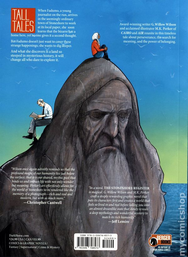 1st printing. Written by G. Willow Wilson. Art and cover by M. K. Perker and Richard Bruning. When refugee and aspiring journalist Fadumo arrives to work at the Stoneshore Register, she is entering a far stranger place than she realizes. At first, the colossal stone giant overlooking the rundown, seemingly ordinary Pacific Northwest fishing town seems like the only remarkable element. But he is not the only strange surprise: changelings, selkies, cursed ships-the bizarre has a home in Stoneshore, yet no one gives it a second thought. But Fadumo doesn't just want to cover these odd occurrences. She wants to dig deeper. And what she discovers is a land so steeped in mysterious history, it will change all who dare to explore it. Softcover, 128 pages, B&W. Cover price $24.99.