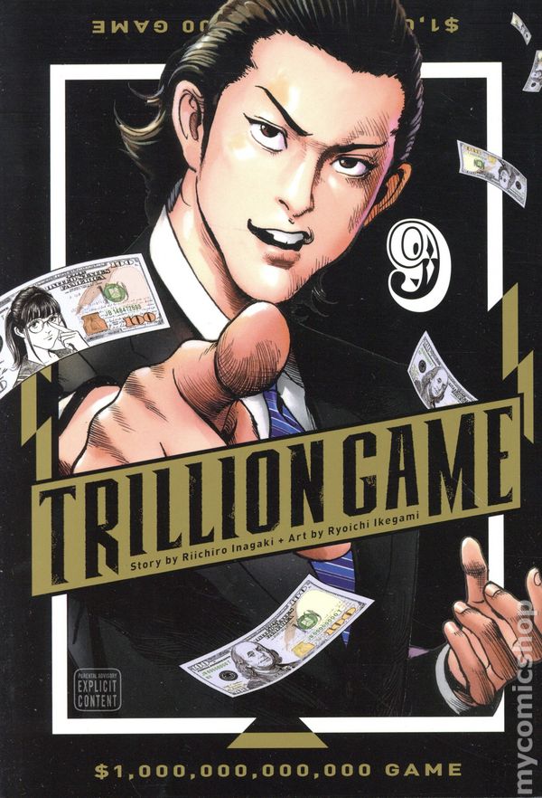 Volume 9 - 1st printing. Written by Riichiro Inagaki. Art and cover by Ryoichi Ikegami. Translated by Stephen Paul. A charming sweet talker and a timid computer programmer team up with hopes of making a trillion dollars and getting everything they've ever wanted in this world! Self-proclaimed worlds greediest man Haru and timid computer whiz Gaku set out to make a trillion dollars. They start the company Trillion Game to accomplish this task and hope to iron out the details as they go. With charm, technical skills, and no business plan, can these unlikely friends reach their lofty goal? Haru and Gaku have Trillion Game Inc. on the verge of becoming a publicly traded company. At a presentation to investors, Haru unleashes a storm of wild claims! What is his harebrained scheme to drive up their stock price? Softcover, 5-in. x 7-in., 200 pages, full color. Mature Readers Cover price $14.99.