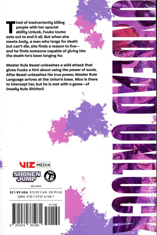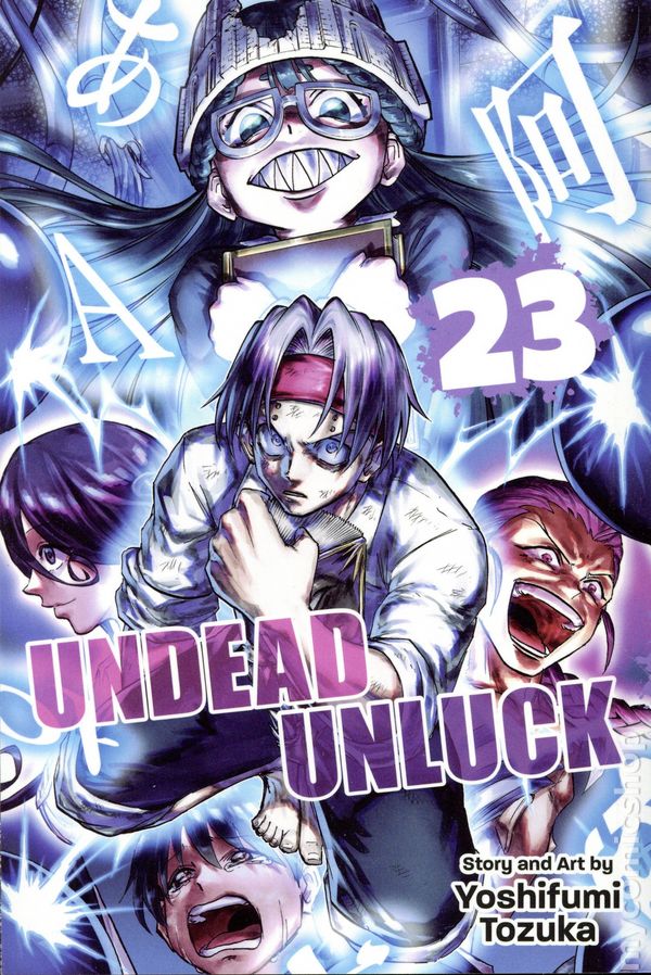 Volume 23 - 1st printing. Story and Art by Yoshifumi Tozuka. Translated by David Evelyn. What happens when an unlucky girl meets an undead guy? Pure chaos! Tired of inadvertently killing people with her special ability Unluck, Fuuko Izumo sets out to end it all. But when she meets Andy, a man who longs for death but can't die, she finds a reason to live—and he finds someone capable of giving him the death he's been longing for. Master Rule Beast unleashes a wild attack that gives Fuuko a hint about using the power of souls. After Beast unleashes his true power, Master Rule Language arrives at the Unions base. Nico is there to intercept her, but he is met with a game—of Deadly Rule Shiritori! Softcover, 5-in. x 8-in. 192 pages, B&W. For older teen audiences Cover price $11.99.