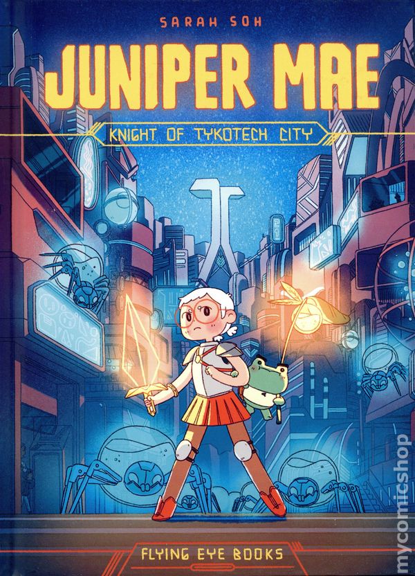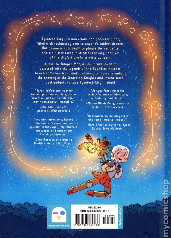 1st printing. Story and art by Sarah Soh. An action-packed sci-fi story for fans of Hilda and Amulet. Tykotech City is a marvelous and peaceful place, filled with technology beyond anyone's wildest dreams. But as power cuts begin to plague the residents, and a sinister force infiltrates the city, the lives of the cityfolk are in terrible danger… It falls to Juniper Mae, a tiny, brave inventor, obsessed with the legends of the Guardian Knights, to overcome her fears and save her city. Can she embody the bravery of the Guardian Knights and invent some cool gadgets to save Tykotech City in time? Hardcover, 6 1/2-in. x 9-in., 64 pages, full color. Age 7-9 years Cover price $22.99.